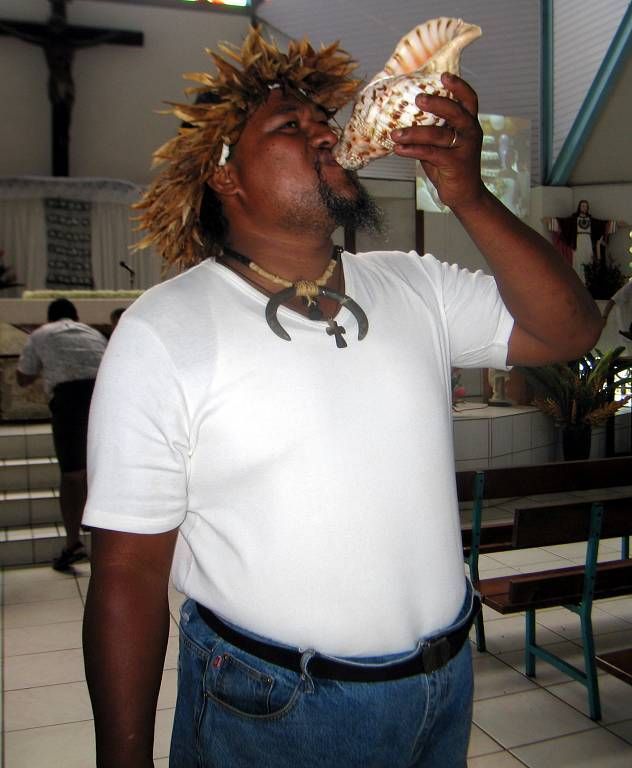 Punkt 8h30 marschieren 2 Priester und 6 Assistenten, in weisse Soutanen gekleidete Männer (diesmal keine Ministranten dabei), alle 8 mit Blumenkränzen um den Hals, durch den Mittelgang zum Altar. Zuletzt kommt noch ein Mann, mit der Statur eines etwas mageren Sumoringers, der in ein Muschelhorn bläst. Toll tönt das! Um den Kopf trägt er einen Kranz aus Palmenblättern (???).