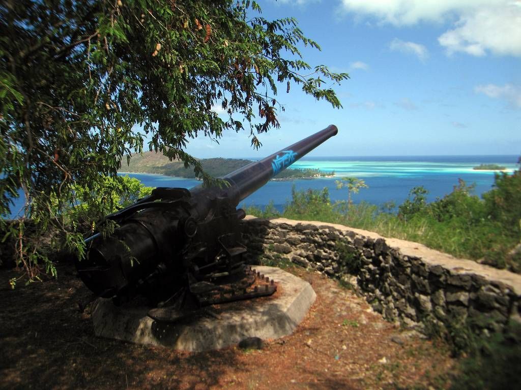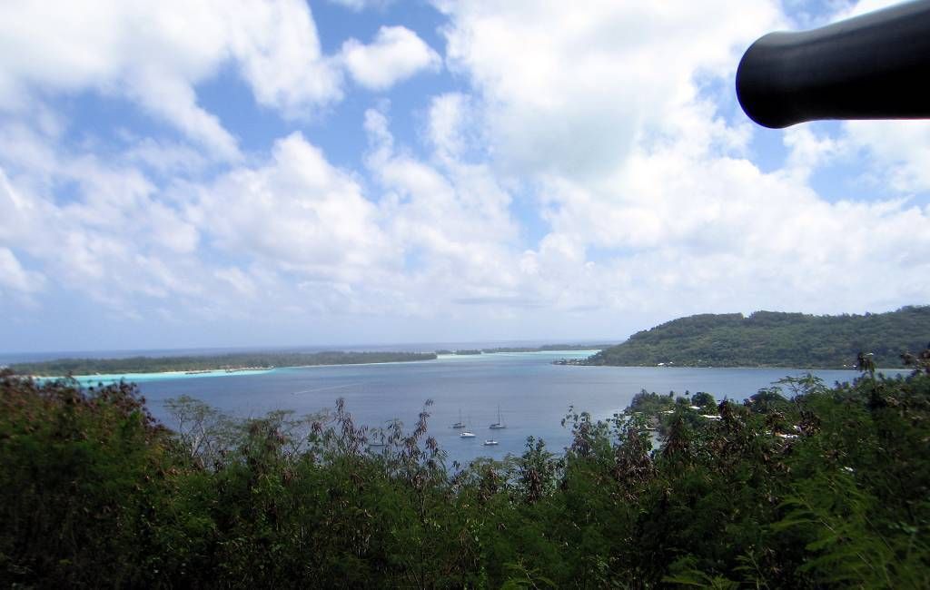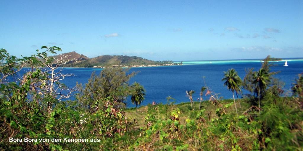 Paul und ich laufen zum Ende des Ortes und machen eine lebensgefährliche Kletterpartie, direttisima den steilen Hang hinauf zu den zwei Kanonen, die die Amerikaner nach dem Zweiten Weltkrieg hier „vergessen“ haben. Von hier oben haben wir einen traumhaft schönen Ausblick auf die Lagune. Für den Rückweg nehmen wir den „normalen“ Weg, aber der ist enorm weit. Wir kommen auch am Bora Bora Yachtclub vorbei und setzen uns dort in die bequemen Sessel des Restaurants, in der Absicht, nach diesem Gewaltsmarsch etwas zu trinken. Durstig verlassen wir den Yachtclub wieder, ohne eine Menschenseele gesehen zu haben.