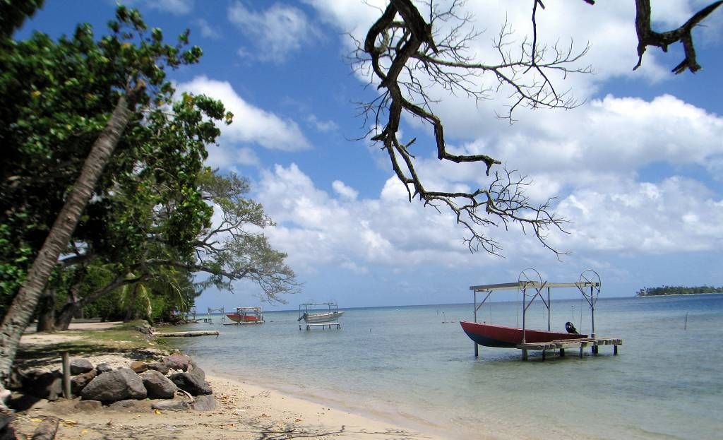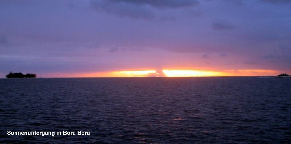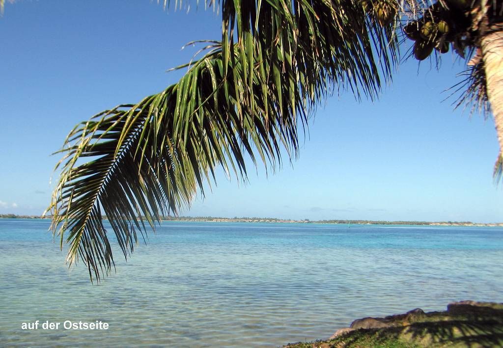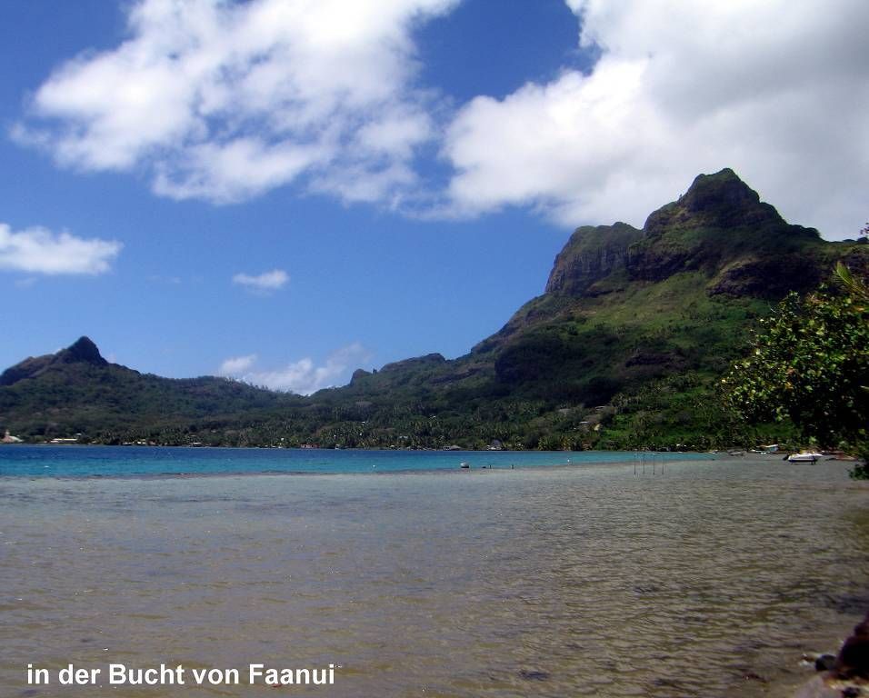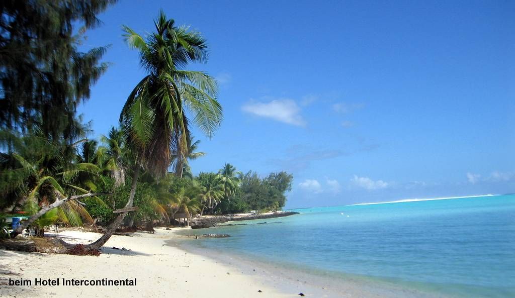 Herrliches Wetter. Den Morgen verbringen wir an Bord mit ein wenig Herumhaushalten. Um 14h sind wir, Paul und ich, in Vaitape und erkundigen uns wieder im Tourismus Büro, was man wo unternehmen könnte. Die Frau dort ist eher unfreundlich! Jetzt entschliessen wir uns, rund um die Insel Autostopp zu machen. Die 32 Kilometerlein werden wir doch wohl noch schaffen, oder? Aber es ist gar nicht so einfach! Die ersten etwa 25 Autos fahren cool an uns vorbei. Aber dann hält eine junge Frau in einem weissen Renault Clio an und nimmt uns mit. Auf ihre Frage, wo wir denn hinwollen, sagen wir vage:“Auf die andere Seite der Insel.“ Sie heisst Vanessa und muss ihrem Mann etwas bringen. Sie lässt uns daher an der Südspitze der Insel, beim Hotel Intercontinental, am Strand aussteigen. Hier ist es herrlich schön. Das Wasser ist wieder einmal kitschig blau und die Wellen branden draussen weissschäumend aufs Riff. Hie und da kommt eine gewaltige Welle über das Riff und braust mächtig auf den Strand. Vanessa holt uns nach etwa 15 Minuten wieder ab und fährt extra für uns rund um die Insel. Wir können es fast nicht glauben. Unterwegs erklärt sie uns was wo ist und welche Hotels wegen Konkurs geschlossen sind, und es sind einige! Aber trotzdem scheint die Insel Bora (so sagen die Einheimischen) nur aus Hotels mit vielen palmblättergedeckten Bungalows zu bestehen. Auf der Ostseite der Insel schimmert das Wasser in allen erdenklichen Blaunuancen. Wunderschön!