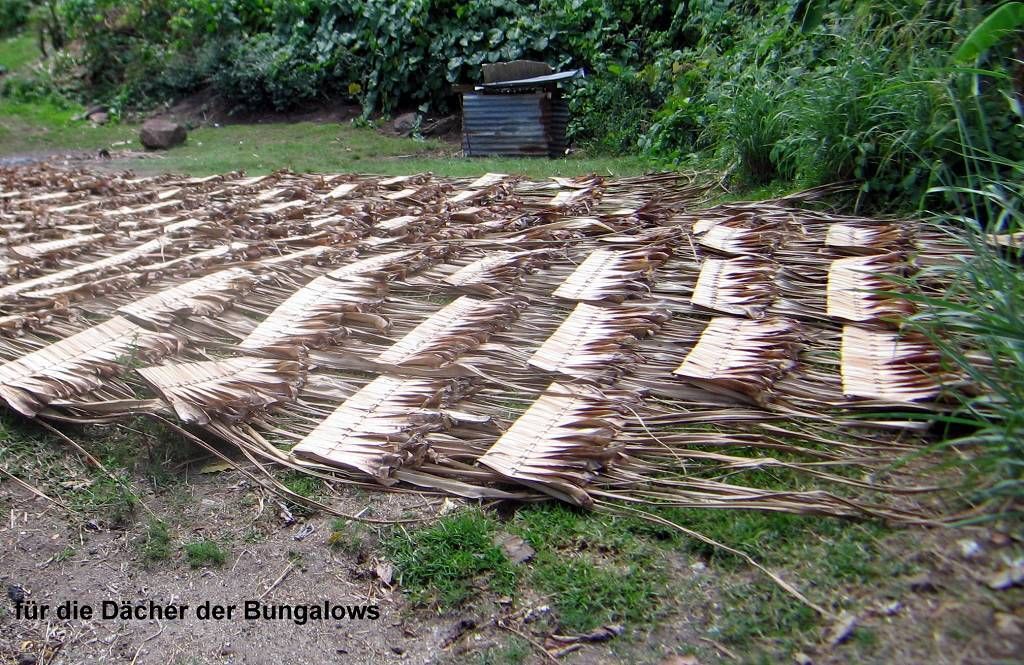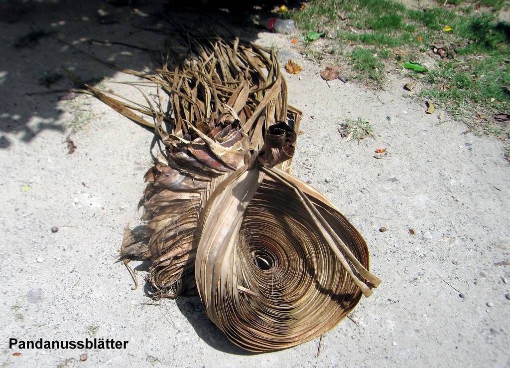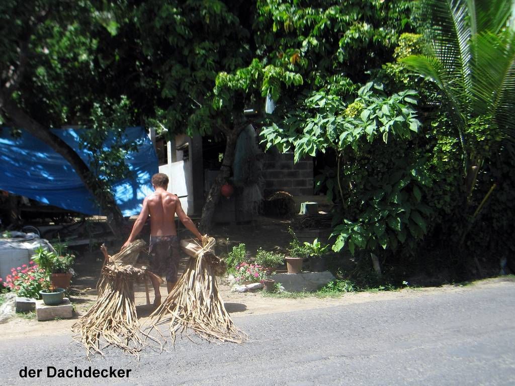 Unterwegs treffen wir noch auf einen „Dachdecker“ Er schleppt gerade Bündel von Pandanussblättern über die Strasse. Die dienen dazu, in den Hotels die Bungalows zu decken.