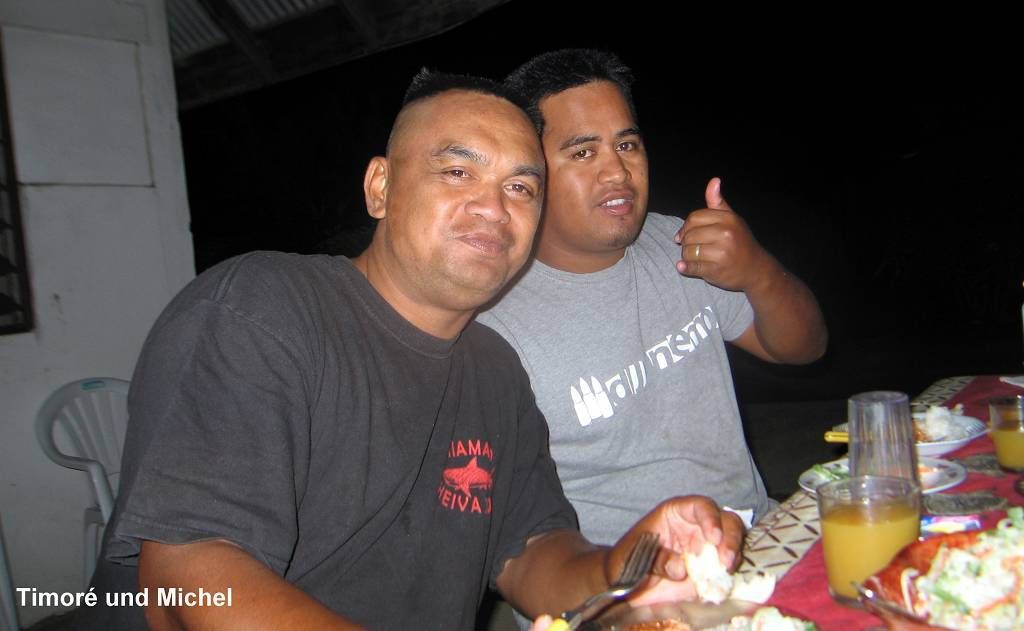 Um Punkt 18h30 werden Paul und ich bei der Total Tankstelle, wo wir das Dinghy anbinden, von Timoré mit dem Renault Clio abgeholt. Den kennen wir zwar nicht, aber er kennt unsere Namen. Bei Vanessa (25 Jahre, Securityangestellte in einem Hotel) zu Hause, lernen wir ihren Mann Michel (27, Bauarbeiter) kennen, dazu Marie (31, Securityangestellte in einem Hotel), die Adoptivschwester von Vanessa und Cousin Timoré (36, Kranführer). Hier hat es zwei kleine Hunde (2 Monate alt), die heissen Iaorana und Beethoven, die Mutter dazu Milou und in einer Kiste ein kleines Schwein, das sehr passend Rôti (Braten) heisst und erbärmlich quiekt.
