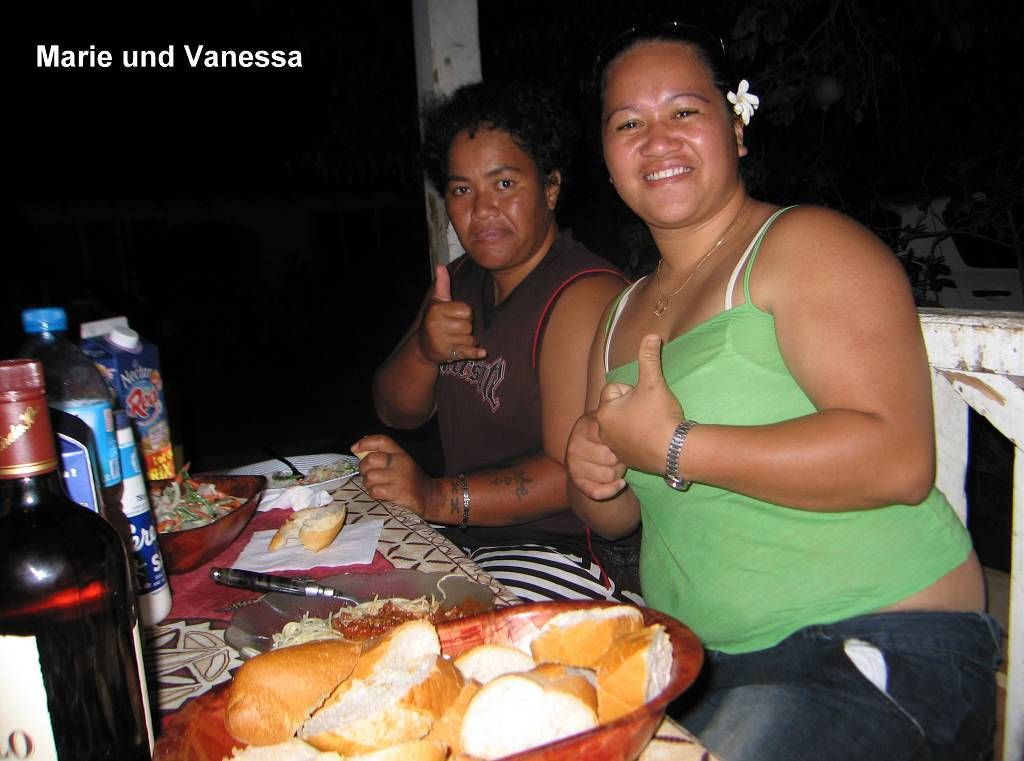 Als wir einmal rundum sind, nach ca. einer Stunde, zeigt uns Vanessa wo sie wohnt, in der Nähe des Bora Bora Yacht Clubs, und lädt uns kurzentschlossen zum Abendessen zu sich nach Hause ein. Wir sind platt! Jetzt lässt sie uns im Zentrum von Vaitape aussteigen. Wir kaufen schnell ein Baguette und trinken dann im „Aloe Café“ etwas. Doris und