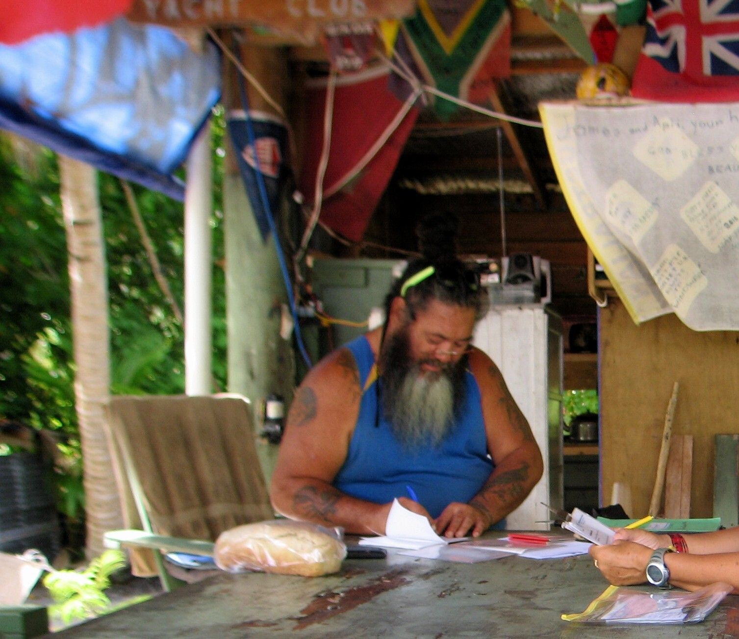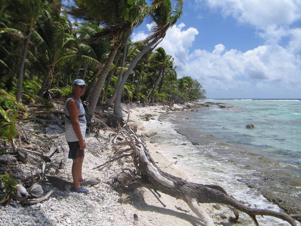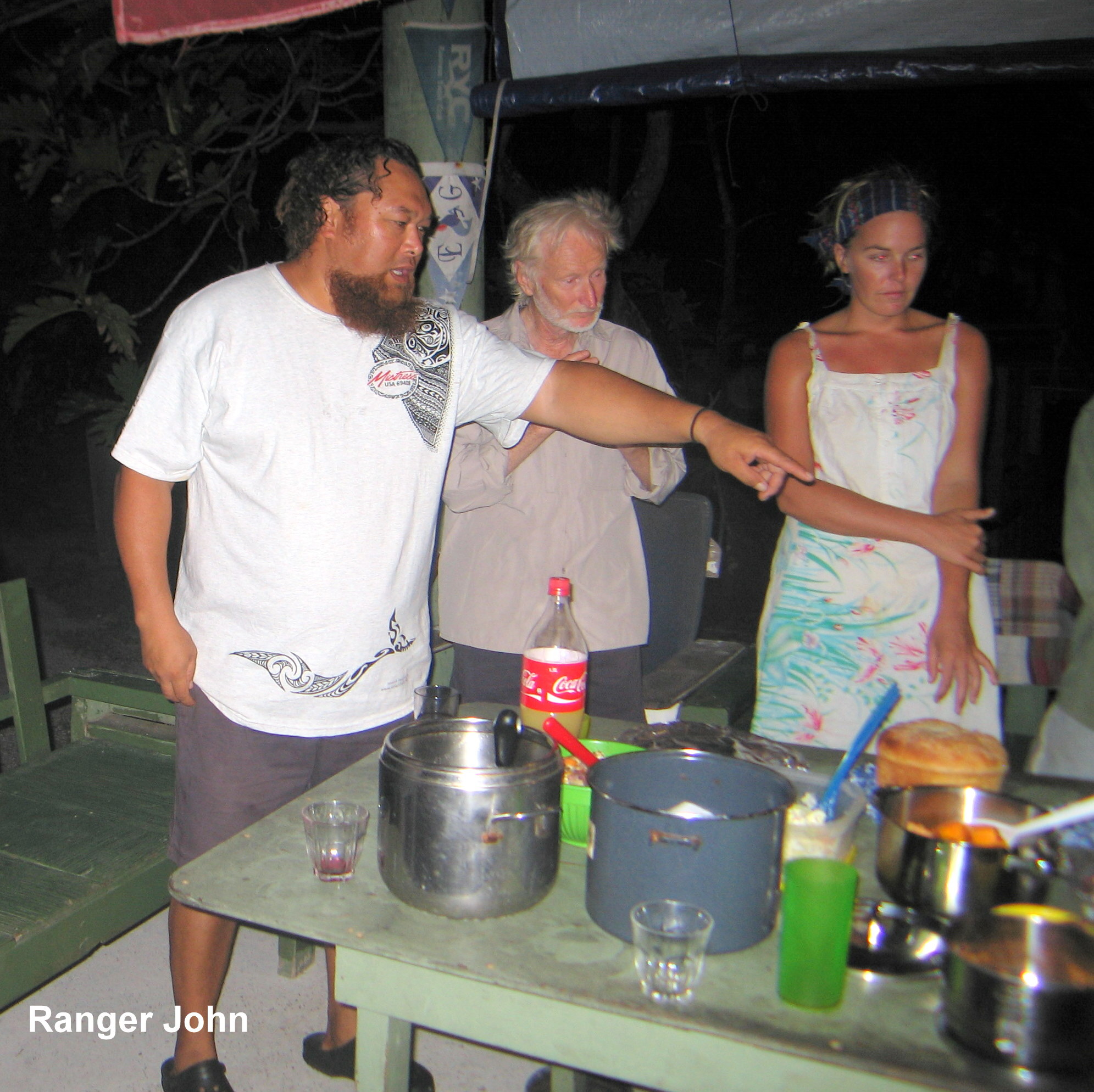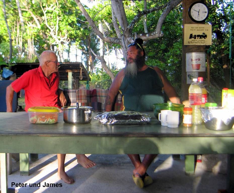 Wir waschen Wäsche und nachdem diese aufgehängt ist, fahren wir per Dinghy auf die Insel Suwarrow, zum Einklarieren. Zwei tolle Südsee-Typen empfangen uns, James und John. Die beiden sind sehr nett. Sie wohnen 6 Monate lang, vom 1.Mai bis zum 1.November, hier auf der Insel als Ranger (Wächter). James erledigt mit uns das Einchecken und gleichzeitig das Auschecken. Wir müssen 50 US$ bezahlen für den Suwarrow-Nationalpark und dürften dafür zwei Wochen lang hier bleiben. Leider haben wir aber nicht so lange Zeit. Nun kommen noch Karen und Peter mit Sohn Niklas und der kleinen Ilka, vom deutschen Schiff „Mango“ und wir erfahren, dass heute Abend ein „Potluck“ stattfindet.