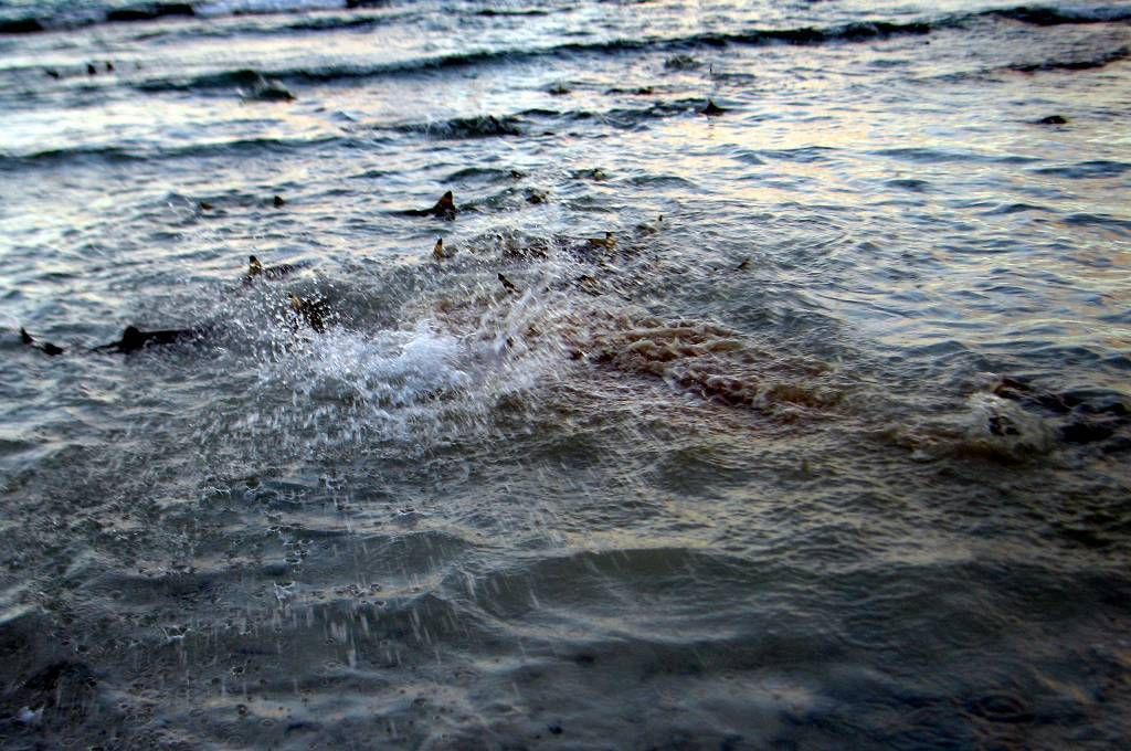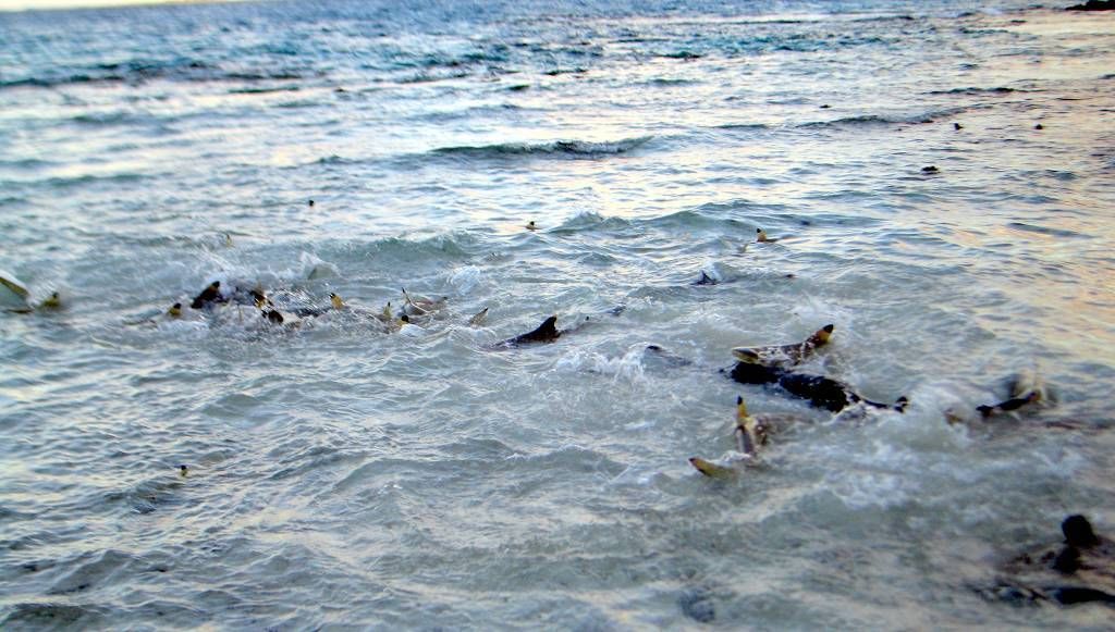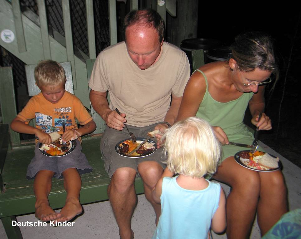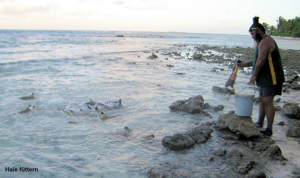 Um 17h30 sind wir bei der Hütte von den zwei Rangern James und John. Wir sind eine schöne Gruppe von 6 Kindern und 15 Erwachsenen, plus die 2 Ranger. Am Nachmittag ist Ranger John extra fischen gegangen, damit es etwas für den Grill hat. Um 18h30 marschiert die ganze Gruppe mit einem Eimer voll Fischabfällen auf die Ostseite der Insel, um dort „Shark feeding“ zu machen. James ruft die Haie, wie wenn er eine Herde Schafe oder Geissen rufen würde und tatsächlich: sie kommen in Scharen. Es sind bestimmt 50 Stück, grössere und kleinere Haie. Die meisten davon Schwarzspitzen-Riffhaie, nur ganz wenige Weissspitzen-Riffhaie. James schmeisst ihnen die Fischabfälle ins Wasser und es brodelt nur so, wo die Haie sich darum streiten. Boahhh, da möchte man nicht dazwischen geraten!