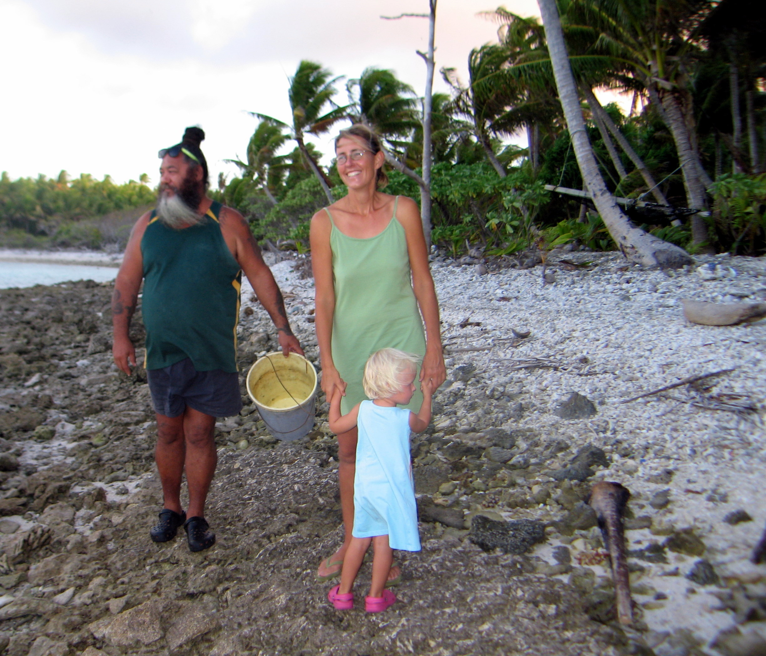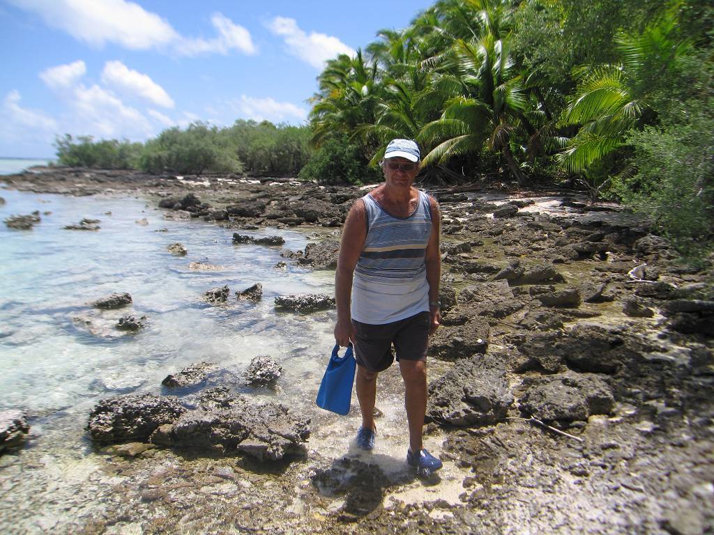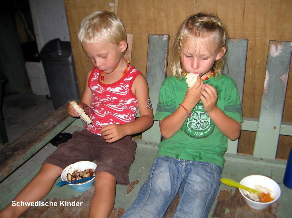 Wir waschen Wäsche und nachdem diese aufgehängt ist, fahren wir per Dinghy auf die Insel Suwarrow, zum Einklarieren. Zwei tolle Südsee-Typen empfangen uns, James und John. Die beiden sind sehr nett. Sie wohnen 6 Monate lang, vom 1.Mai bis zum 1.November, hier auf der Insel als Ranger (Wächter). James erledigt mit uns das Einchecken und gleichzeitig das Auschecken. Wir müssen 50 US$ bezahlen für den Suwarrow-Nationalpark und dürften dafür zwei Wochen lang hier bleiben. Leider haben wir aber nicht so lange Zeit. Nun kommen noch Karen und Peter mit Sohn Niklas und der kleinen Ilka, vom deutschen Schiff „Mango“ und wir erfahren, dass heute Abend ein „Potluck“ stattfindet.