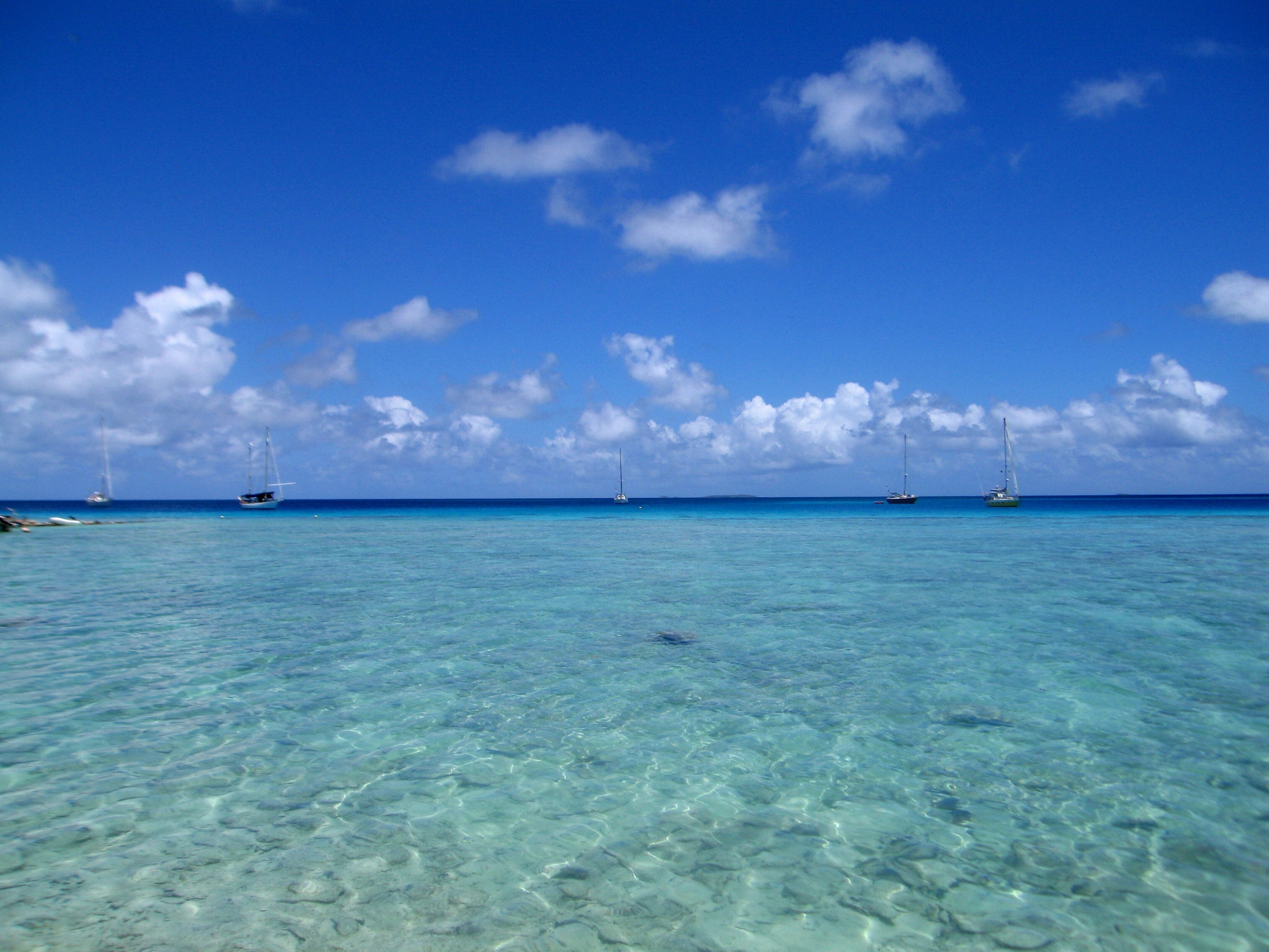 Um 11h15 schmeissen wir den Anker auf 12m Tiefe ins kitschige türkisgrüne Wasser im Suwarrow-Atoll, hinter der Insel Anchorage. Bei wunderschöner Sonne und in wunderschöner Lagune! Als Erstes sticht uns eine riesige Schweizerflagge ins Auge. Es sind mit uns jetzt 5 Segelschiffe da. Ein Schwede, ein Deutscher, ein Australier und mit uns jetzt zwei Schweizer, die Schweizer kennen wir aber nicht.
