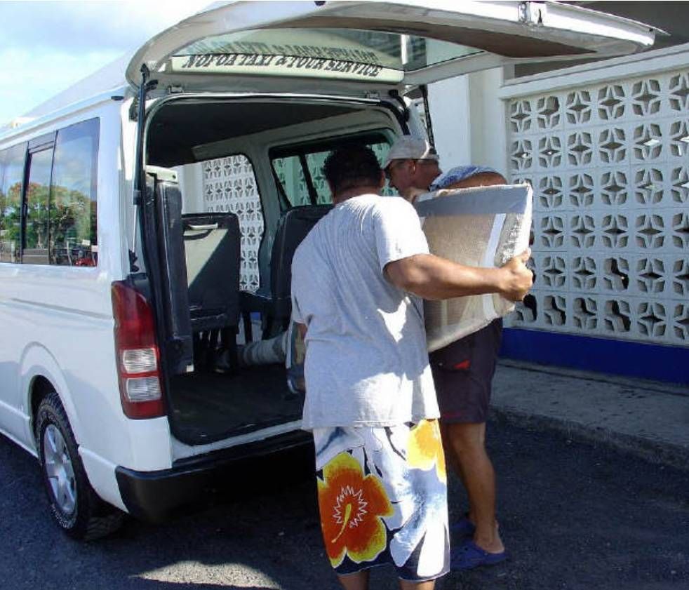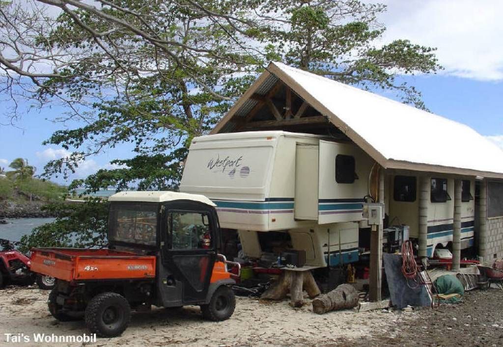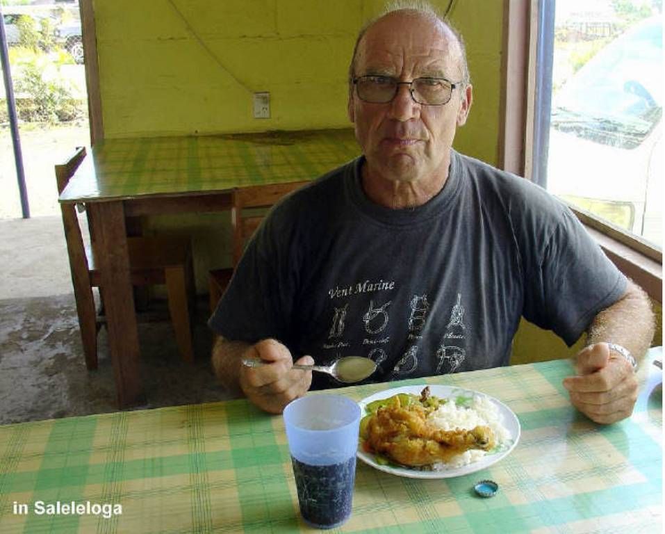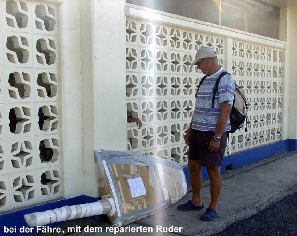 Wir haben beide in diesem fremden Bett nicht sehr viel geschlafen. Die Chefin unseres Hotels weckt uns wie versprochen um Punkt 05h. Unsere paar Sachen sind schnell im Rucksack verstaut und wir sind zu Fuss unterwegs zur Fährenanlegestation. Die „LADY SAMOA 3“ legt sehr pünktlich um 06h ab. Nach 70 Minuten sind wir drüben auf der Insel Upolu, wo uns Ian und seine Freundin Rosy schon erwarten. Mit Ian's winzigem Autolein fahren wir zum Faleolo Flugplatz, zum Frachtbüro von Victor. Paul entdeckt unter tausend anderen Gepäckstücken sofort unser repariertes Ruder. Aber wir dürfen es nicht sofort in Empfang nehmen. Wir müssen zuerst noch beim Zoll vorbei, wieder zurück zum Frachtbüro, 15 Tala bezahlen (ca. 5,55 SFr.) und bekommen das Ruder ausgehändigt. Wir verabschieden uns herzlichst von unseren treuen Helfer Ian und springen mitsamt dem Ruder in ein Grossraumtaxi, in einen Van. Ian bleibt hier. Er muss am Montag eine mehrtägige Angelfahrt mit vier Australischen Touristen machen. Bis zur Fähre ist es nicht weit. Der Chauffeur wollte 15 Tala für die Fahrt, aber jetzt will er plötzlich 20 Tala haben, weil das Ruder so schwer sei (45kg ist es). Paul droht ihm lauthals mit der Polizei und er ist nun doch mit 15 Tala zufrieden. Wir (Paul und ich) tragen das schwere Ding in die Fähre. Ein sehr netter Passagier löst mich dabei ab, wofür ich ihm sehr dankbar bin. Uff, geschafft! Mit der gleichen Fähre, mit der wir gekommen sind, schippern wir von 08h bis 9h10 zurück auf die Insel Savaii, nach Saleleloga. Hier nehmen wir uns wieder ein Grossraumtaxi und fahren von 09h30 bis 11h zu „unserem“ Resort zurück. (Kosten: 120Tala) Die Fahrt ist wunderschön, auf der Südseite der Insel entlang. Im Resort hilft uns Nu'u, der Restaurantangestellte, das Ruder zu unserem Dinghy zu schleppen und auf's Dinghy aufzuladen. Zurück auf der MABUHAY gibt es kurz einen Schluck Wasser zu trinken und dann machen wir uns sofort an die Arbeit. Weil das Ruder schwimmt, hängen wir soviel von unserem Tauchblei daran, dass es Paul unter Wasser drücken und einfädeln kann. Ich ziehe von oben an einer Leine, die wir vorher daran befestigt haben. Jetzt kann ich oben den Haltering mit einem Querstift festmachen und das Ruder hält. Das Ganze hat keine 15 Minuten gedauert, Paul findet, das war viel besser als er erwartet hatte. Toll, die MABUHAY hat ihr Ruder wieder! Wir sind richtig stolz und geniessen nun unser Salatmittagessen. Kaum eine Stunde später schüttet es in Strömen und wir halten ein wohlverdientes Mittagsschläfchen.