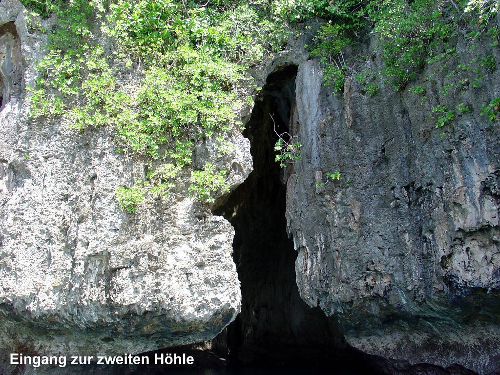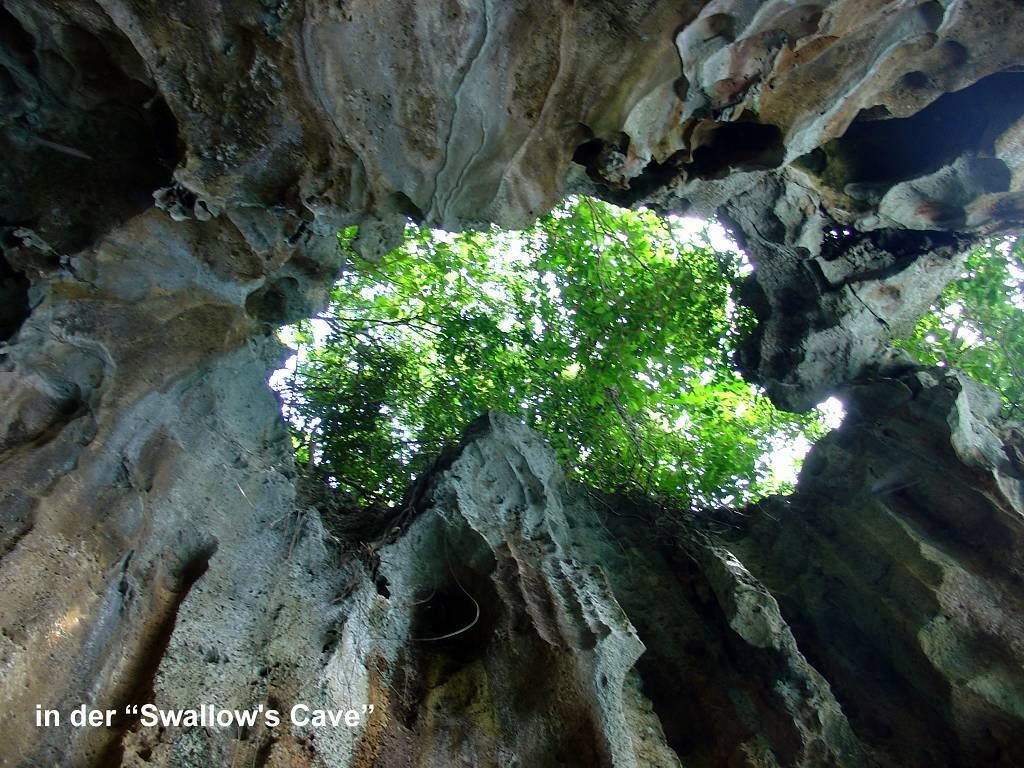 Am Nachmittag nehmen wir die „sail away's“ mit und fahren mit unserem Dinghy ans nördliche Ende der Insel Kapa. Hier besuchen wir die „Swallow's Cave“. Wir können direkt mit dem Dinghy in die Höhle paddeln und sind sofort total fasziniert. An der hohen Decke hat es ein riesiges Loch, wo man die Bäume und den Himmel sehen kann. Weiter innen in der Höhle hat es Tausende von Schwalbennestern an der Decke. Viele Schwalben fliegen aufgeregt herum. Die Wände schillern in allen Farben und das Wasser ist so klar, dass man bis auf den Grund der Höhle sehen kann. Wir sehen einen grossen Schwarm kleiner Fische. Wenn die Sonne herein scheint ist das Wasser unendlich blau. Wunderschön!