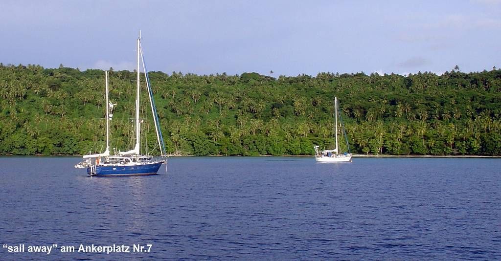 Nach zwei Stunden segeln und motoren ankern wir auf 16m Tiefe auf Ankerplatz Nr. 7. Hier hätte es Bojen zum Festmachen, aber alle 5 sind schon besetzt. Wir baden wieder einmal seit sehr langem (Samoa) im Meer und geniessen es,obwohl der Himmel sehr bewölkt ist. Die Luft ist 28° warm.