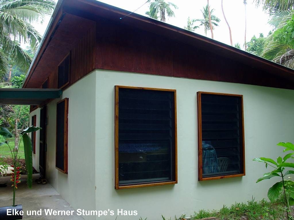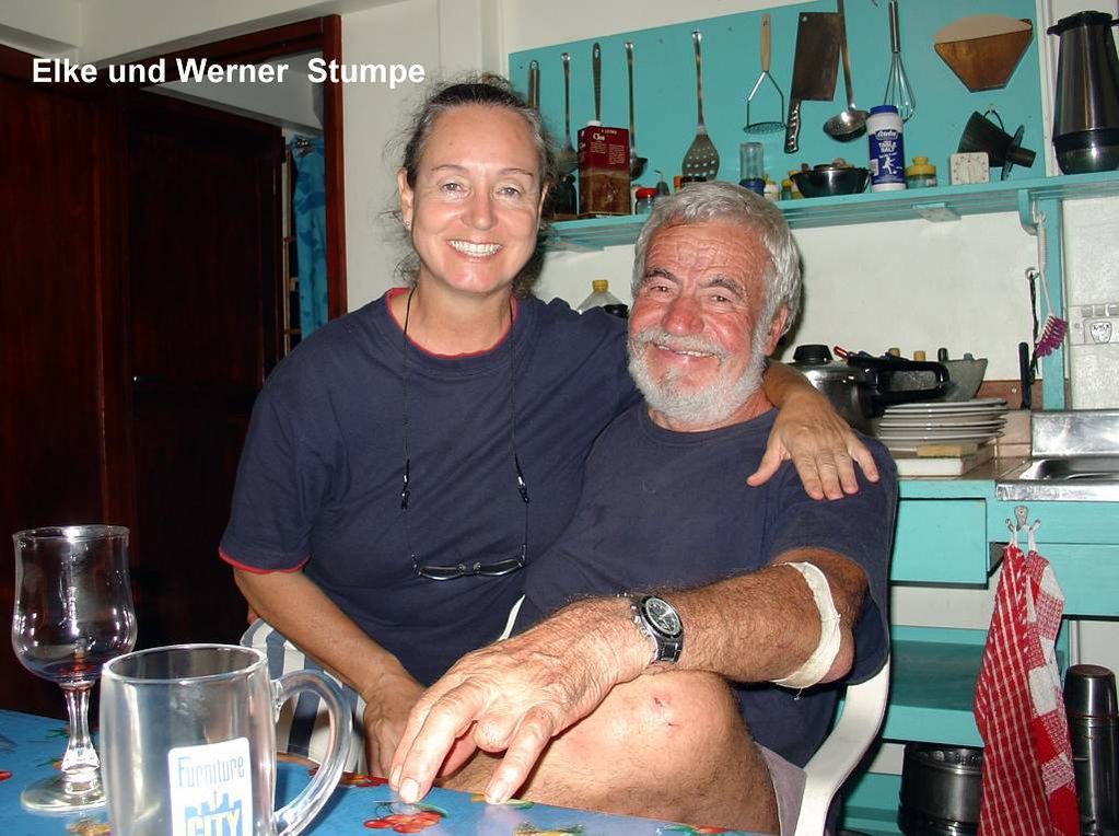 Werner und Paul machen sich kurz nach 11h im Dinghy auf den Weg zum Deutschen Trans-Ocean-Stützpunktleiter Werner Stumpe und seiner Frau Elke. Die haben hier ein Haus und ein Motorboot. Der Motor dieses Bootes will nicht so recht laufen und Paul hat angeboten, mal nachzuschauen, wo's fehlt. Nach 2½ Stunden kommen die beiden zurück, der Motor laufe jetzt! Nach dem kurzen Mittagessen, gehen Elke, Werner (Stumpe) und Paul ca. ½ Stunde auf Probefahrt, die erfolgreich verläuft. Gegen 16h sind wir, mit „sail aways“, bei den Stumpes, bei ihrem schönen Häuschen. Wir trinken zusammen Kaffee und wir Gäste machen danach einen langen Spaziergang über die Insel. Beim steilen Abstieg zum Strand, auf der anderen Inselseite, haut es mich um. Voll auf den Rücken. Glück gehabt, ist nichts weiter passiert, ausser ein paar blauen Flecken.