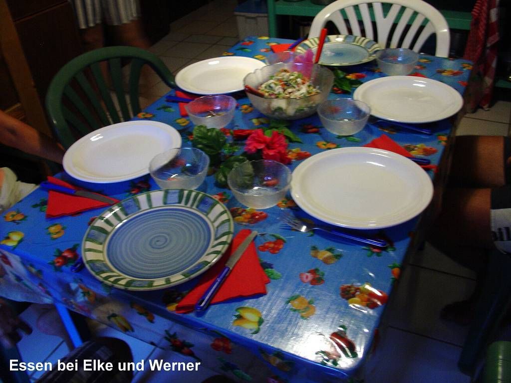 Jetzt gibt es in der Küche (draussen hat es zu viele Mücken) ein feines, von Werner gekochtes Abendessen. Es gibt Reis, gebratene Hühnerteile und einen exquisiten gemischten Salat mit Palmherzen vom eigenen Grundstück. Dazu gibt es selbergebrautes Bier oder Wein. Es ist sehr gemütlich und wir erfahren viel Interessantes aus dem Leben von Elke und Werner. Die beiden sind so nett, dass es uns schwer fällt , sie zu verlassen.