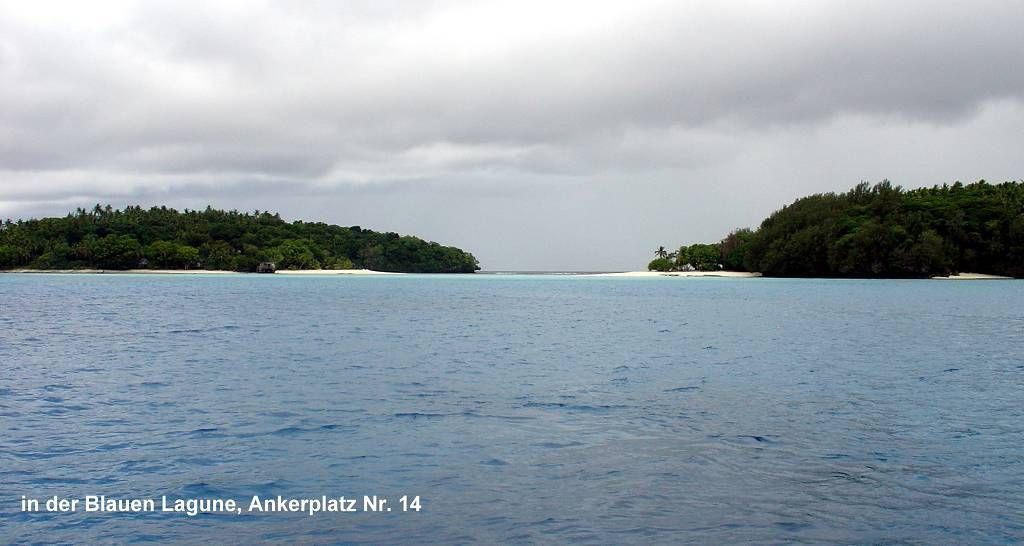 Um 8h45 heben wir den Anker von Ankerplatz Nr. 7 und fahren in ca. 2 Stunden zur Insel Foafa, Ankerplatz Nr.14 oder Blaue Lagune genannt. Wir müssen zwischen ein paar Riffen hindurch und Paul und ich haben wieder das grosse Schlottern. Gott sei Dank fährt die „sail away“ voraus. Die kennen diesen Ankerplatz schon und wissen den Weg. Der Ankerplatz ist wunderschön, macht seinem Namen alle Ehre und wir ankern auf 9 m Tiefe. Nur schade, dass die Sonne nicht scheint, es ist sehr bewölkt. Nach uns kommen noch drei weitere Schiffe in die Bucht zum Ankern.