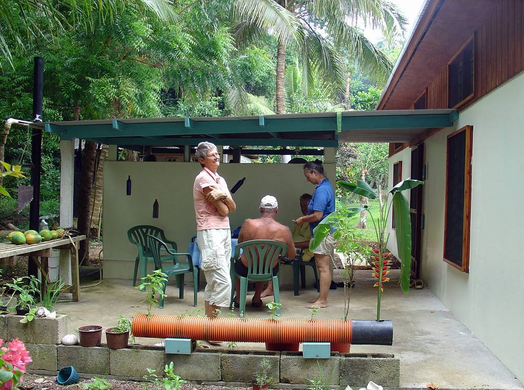 Jetzt gibt es in der Küche (draussen hat es zu viele Mücken) ein feines, von Werner gekochtes Abendessen. Es gibt Reis, gebratene Hühnerteile und einen exquisiten gemischten Salat mit Palmherzen vom eigenen Grundstück. Dazu gibt es selbergebrautes Bier oder Wein. Es ist sehr gemütlich und wir erfahren viel Interessantes aus dem Leben von Elke und Werner. Die beiden sind so nett, dass es uns schwer fällt , sie zu verlassen.