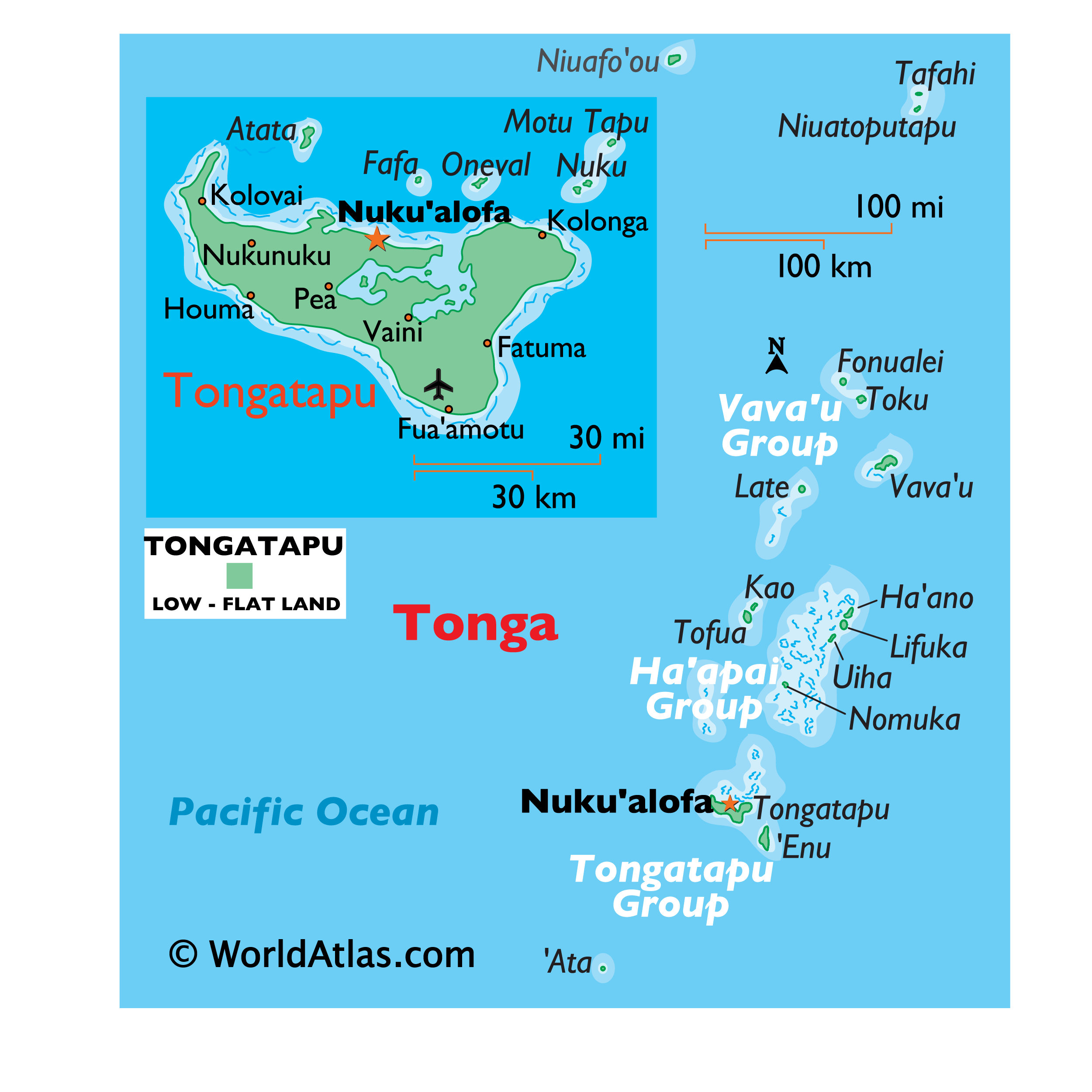 Die Inselgruppen Tongatapu und Haapai sind überwiegend flache Koralleninseln, während die Vava’u-Gruppe vulkanischen Ursprungs ist und gebirgigen Charakter aufweist. Einige Vulkane sind noch aktiv. Auf der 32 Kilometer langen Insel Tongatapu, der größten und fruchtbarsten Insel Tongas, leben etwa 70 Prozent der Bevölkerung.