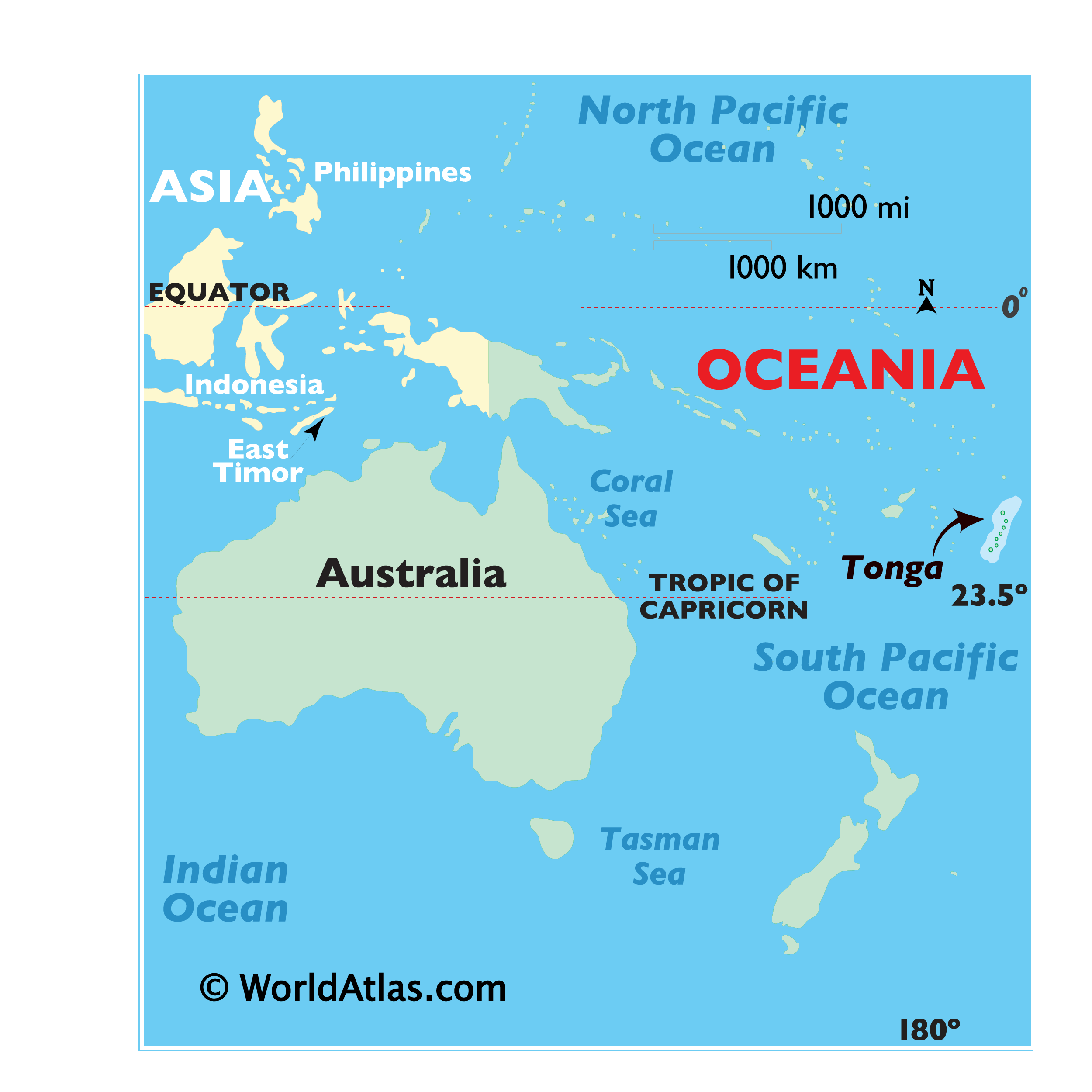 Tonga, Königreich im südlichen Pazifischen Ozean, etwa 650 Kilometer östlich der Fidschi-Inseln gelegen. Das Königreich umfasst einen Archipel aus ungefähr 170 Inseln und erstreckt sich von Norden nach Süden mit den drei Hauptinselgruppen Tongatapu, Haapai und Vava’u sowie mehreren kleineren Inseln. Die Gesamtfläche beträgt 750 Quadratkilometer. Nuku’alofa ist die Hauptstadt und gleichzeitig größte Stadt von Tonga. Sie liegt auf Tongatapu.