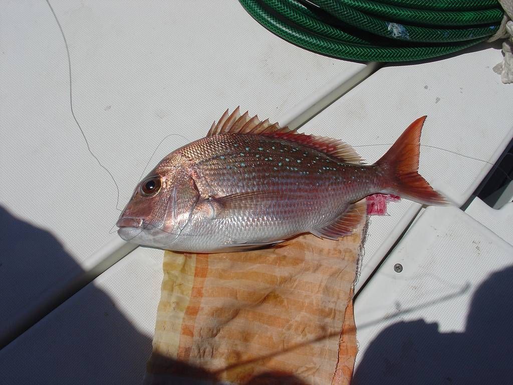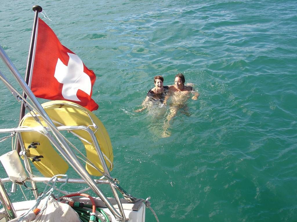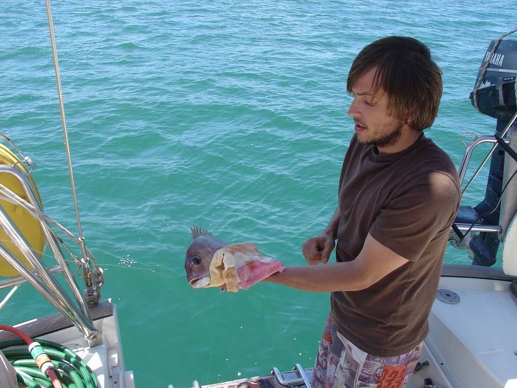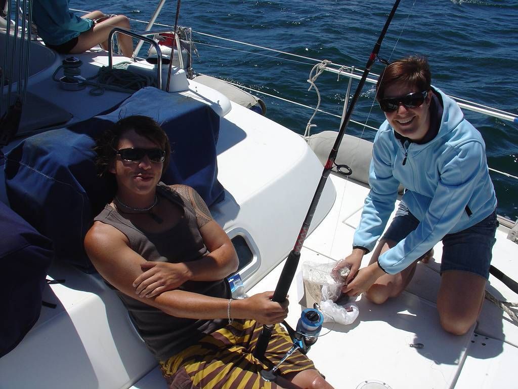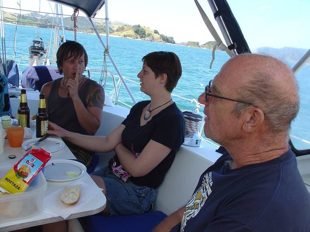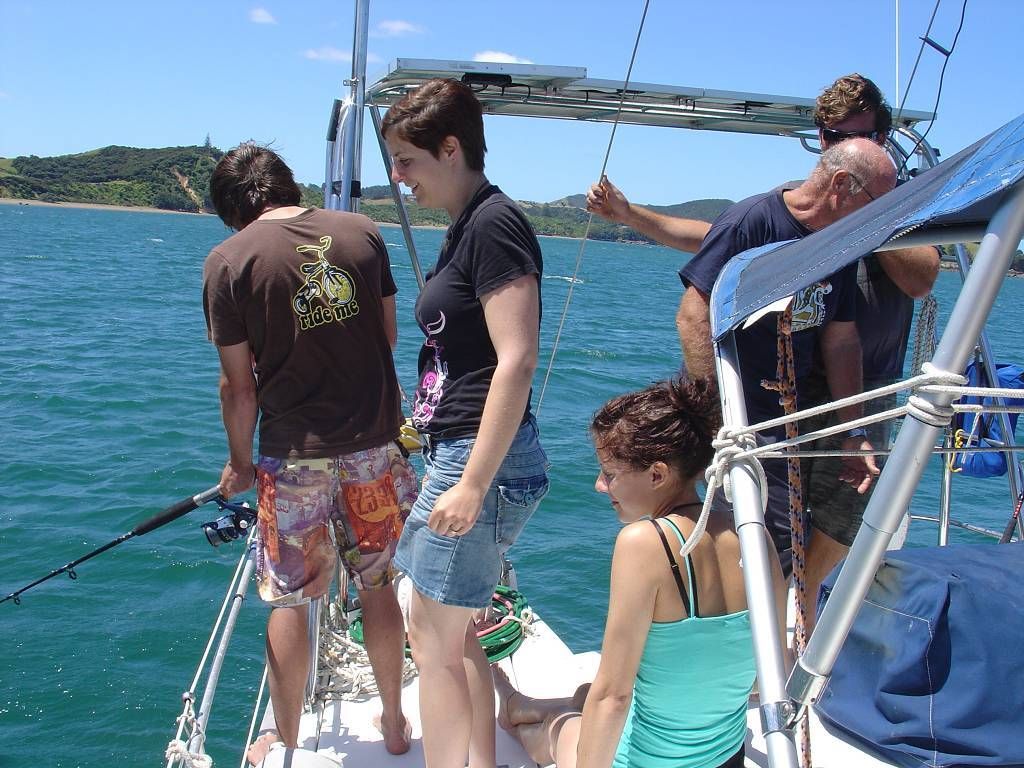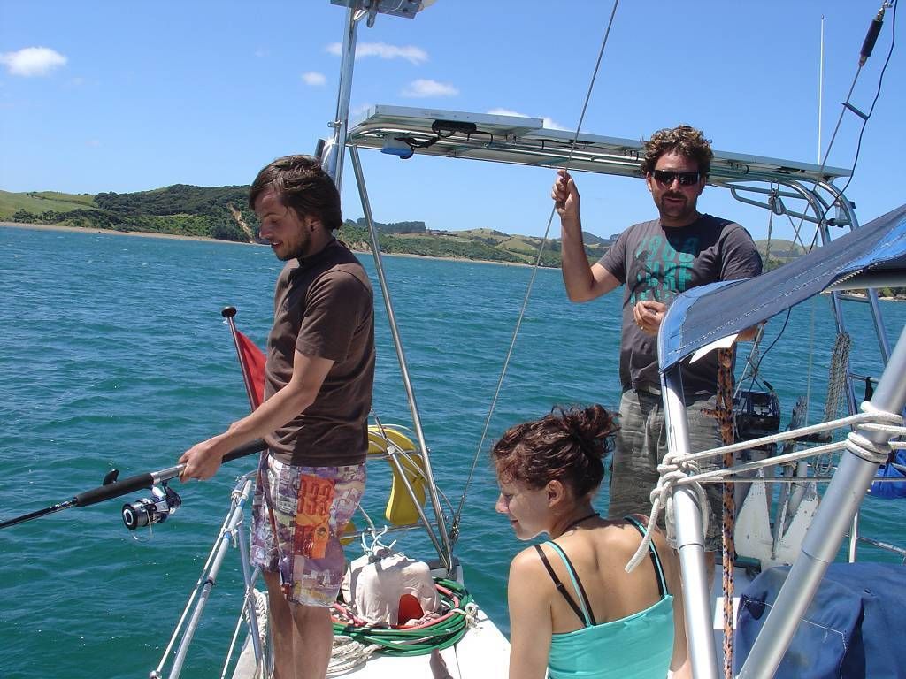 Um 11h rum lösen wir die Leinen vom Steg und fahren raus in die wunderschöne Bay of Islands. Hier sind die ersten Europäer mit ihren Schiffen angelandet (war das der Käpten Cook? Ich habe keine Zeit, mich schlau zu machen!) Es hat guten Wind und wir können ein schönes Stück segeln. Unsere Gäste sind fleissig und helfen bei der Segelei, und ein paar fischen. In einer schönen Bucht ankern wir und jetzt geht die Fischerei erst recht los. Roy und Martin hat es richtig gepackt und jeder möchte den grössten Fisch erwischen. Am Schluss haben wir zwei etwa 30 cm lange Zackenbarsche im Tiefkühler. Die zwei die Martin gleichzeitig an den beiden Haken hatte, waren leider zu klein und wurden von Roy umgehend, zum grossen Leidwesen von Martin, ins Meer zurückgeschmissen. Es geht hoch zu und her und wir haben sehr viel zu lachen. Nach dem kalten Mittagessen wird fieberhaft weitergefischt. Es ist herrlich schöner Sonnenschein. Alexandra und André, die zwei ganz Mutigen, stürzen sich ins Wasser um eine Runde zu baden, brrrr....!!!!