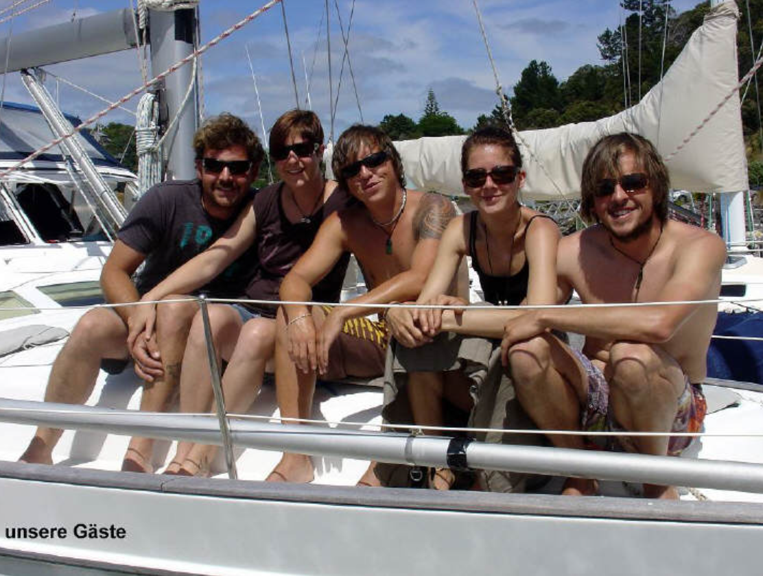 Gegen 19h30 kommt Martin an. Er arbeitet zur Zeit auf einer Baustelle in Whangarei und kommt direkt von dort. Wir kennen ihn nicht, was sich aber sehr schnell ändert. Wir essen schon mal mit ihm zu Abend. Es gibt Spiralen und Bolognaise-Sauce. Es ist fast 21h30 als die beiden Brüder Roy und André (Nachname Herren) ankommen. Roy wohnt und arbeitet in Auckland und André ist zur Zeit bei ihm in den Ferien. Die zwei kommen aus dem Emmental (Affoltern i.E., wo die Schaukäserei ist). Ich wärme für sie das Abendessen nochmals auf. Kurz nach 22h30 kommen endlich Alexandra und Melanie (Freundin von Roy) aus Auckland hier an. Es gibt ein grosses Hallo, wir freuen uns sehr, Alexandra nach ??? Jahren wieder einmal zu sehen. Ich wärme für sie und Melanie das Abendessen auf! Wir haben so viel zu erzählen und zu fragen, dass es Samstag wird (01h) bis endlich jeder seinen Schlafplatz bezogen hat. Paul und ich in unserem Bett, Alexandra und Martin in der Bugkabine, Roy und Melanie in Roy's Van und André in unserem „Popey“ auf dem Marina-Parkplatz.