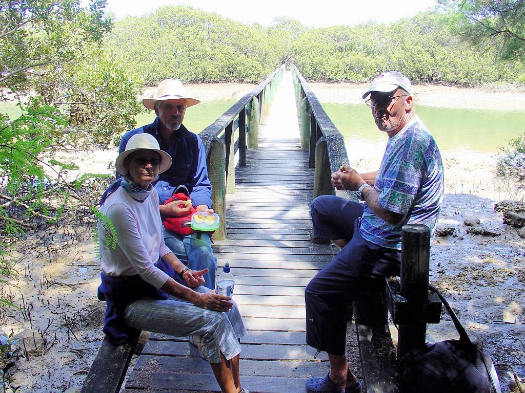 Paul und ich fahren mit Anne und Werner im „Popey“ zum Haruru Wasserfall. Das Wetter ist herrlich und wir folgen dem Waitangi River Richtung Meer. Der Wanderweg ist sehr angenehm im Schatten und flach. Unterwegs sehen wir Kormorane in ihren Nestern und die Jungen die ihre Eltern um Fisch anbetteln. Am Ende einer kleinen Holzbrücke, machen wir eine Pause und Anne und Werner teilen mit uns ihre mitgebrachten Äpfel und ihr Wasser. Wir haben vor lauter Besuch alles vergessen! Wir kehren um und laufen den Weg wieder zurück. Beim Anfang der Brücke (nach etwa 400 m, merkt Paul, dass er unseren Rucksack liegen gelassen hat. Der Autoschlüssel, Schiffsschlüssel, WC-Schlüssel, 1000 Kiwi-Dollars (etwa 700 SFr. vorher, aus dem Automaten geholt), zwei Kreditkarten, die ID's, alles ist in dem Rucksack drin. Paul läuft im Laufschritt zurück zu unserem Rastplatz. Wir anderen warten auf ihn und atmen erleichtert auf, als Paul MIT Rucksack wieder kommt. Uff, Glück gehabt!!! Zurück beim Auto fahren wir ans Meer und essen in einem alten Zucker-Schiff, das zum Restaurant umfunktioniert wurde, ein sehr spätes Mittagessen. Pommes, Chicken-Nuggets und Fish-Nuggets. Das Zeug wird in Papier eingepackt an den Tisch gebracht und man isst direkt aus dem Papier. Anne und Werner bekommen ihre Portionen und fangen schon mal an zu essen. Als Paul und ich NICHTS bekommen, fragt Werner am Buffet, wo denn unser Essen bleibe? Eins von den Papierpaketen wäre unseres gewesen, sagt man ihm. Aha! Also essen wir alle zusammen aus den Papieren und es hat genug für alle!