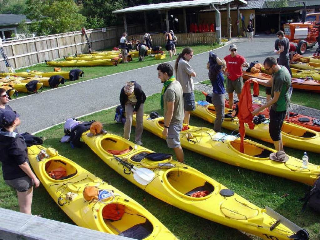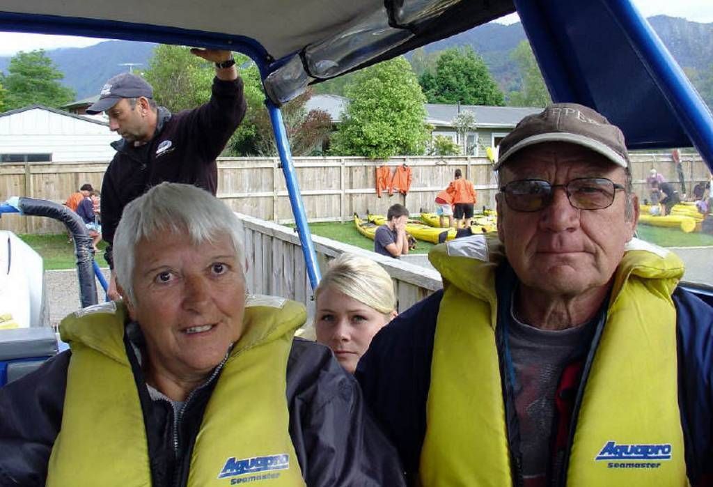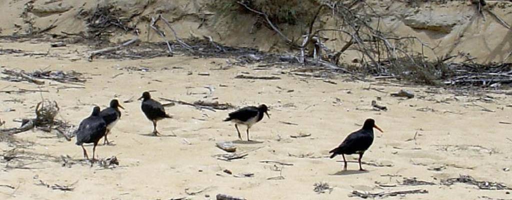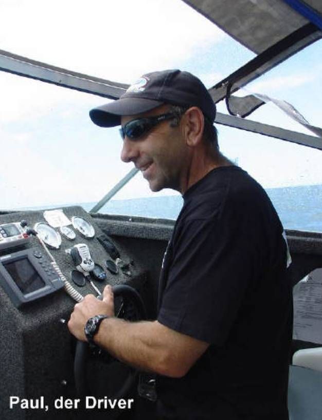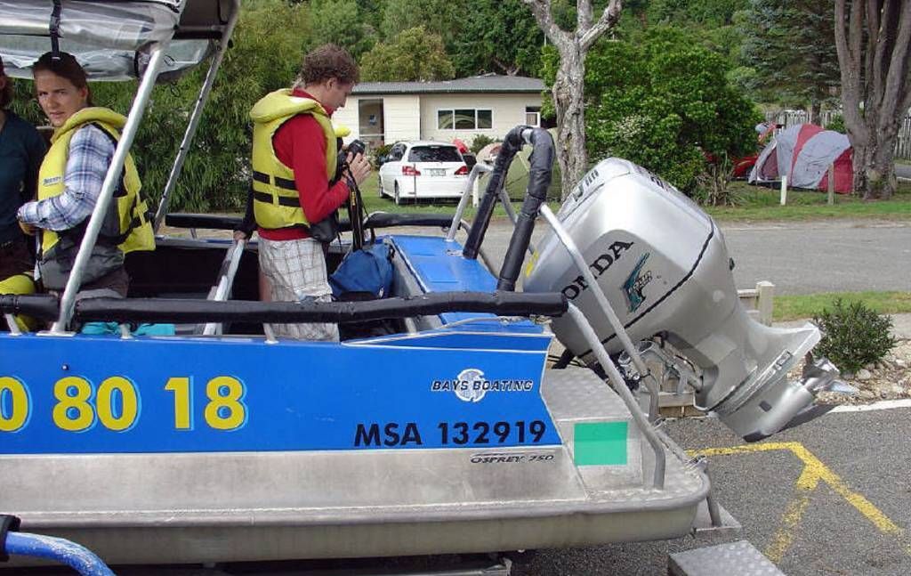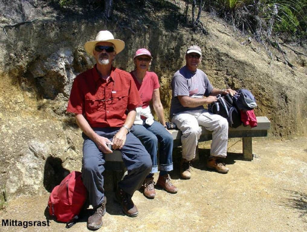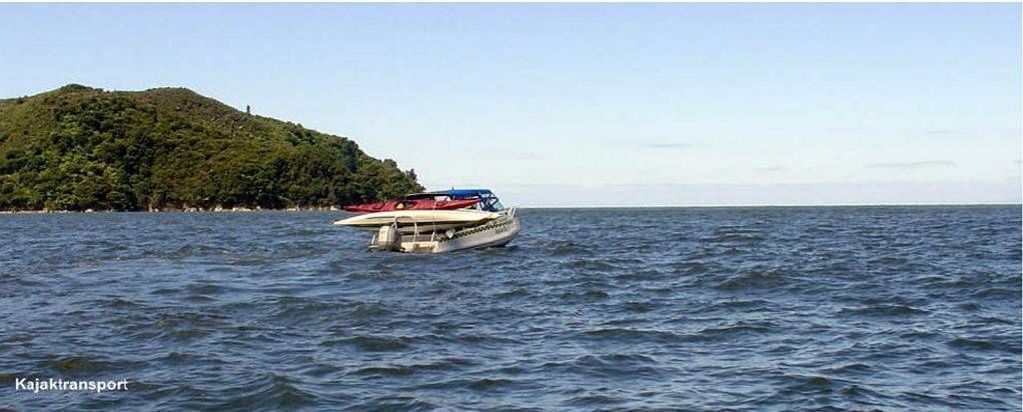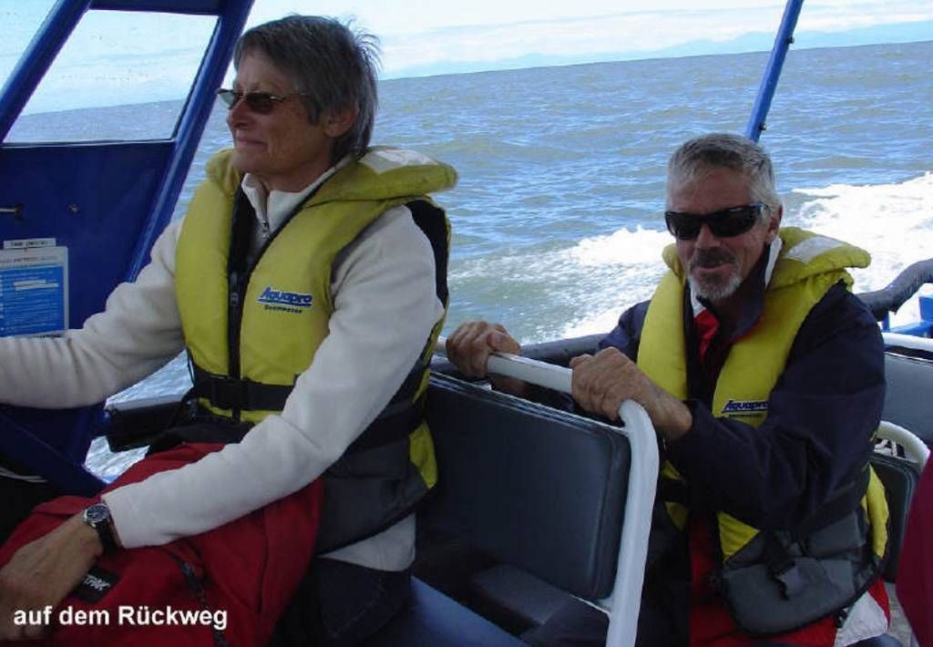 Unterwegs essen wir an der Sonne unser mitgebrachtes Picknick und geniessen die tolle Aussicht. Bei der Bark Bay lädt uns unser Taxi-Speedboot-Fahrer Paul unplanmässig wieder auf. Etwa 1½ Stunden früher als vereinbart. Wir sind viel zu schnell gelaufen. Paul, der Driver, macht mit uns einen Extraabstecher um uns eine Gruppe Seehunde zu zeigen. Es sind ein Baby und ein Riesenbulle dabei. Danach machen wir einen langen Strandspaziergang, weil Paul ein paar Kajakfahrer abholen muss. Wir sehen einen einzigen Pinguin. Leider ist es ein toter, der am Strand liegt. Nachdem Paul die Kajakfahrer samt ihren Kajaks aufgeladen hat, brettern wir volle Pulle zurück zum Marahau – Campingplatz. Wir fahren direkt mit dem Boot auf den Anhänger am Traktor und werden zurück auf den Platz beim Camp gefahren. Um 16h sind wir zurück bei unseren Autos.