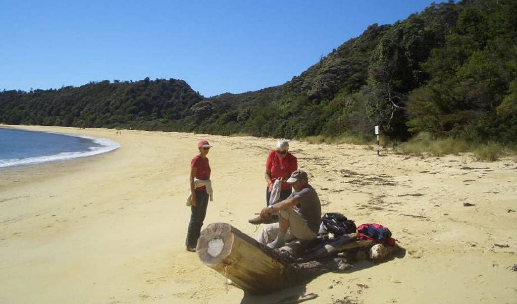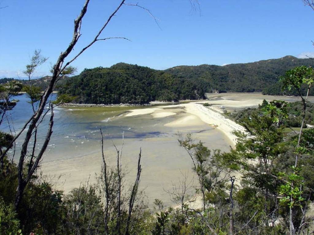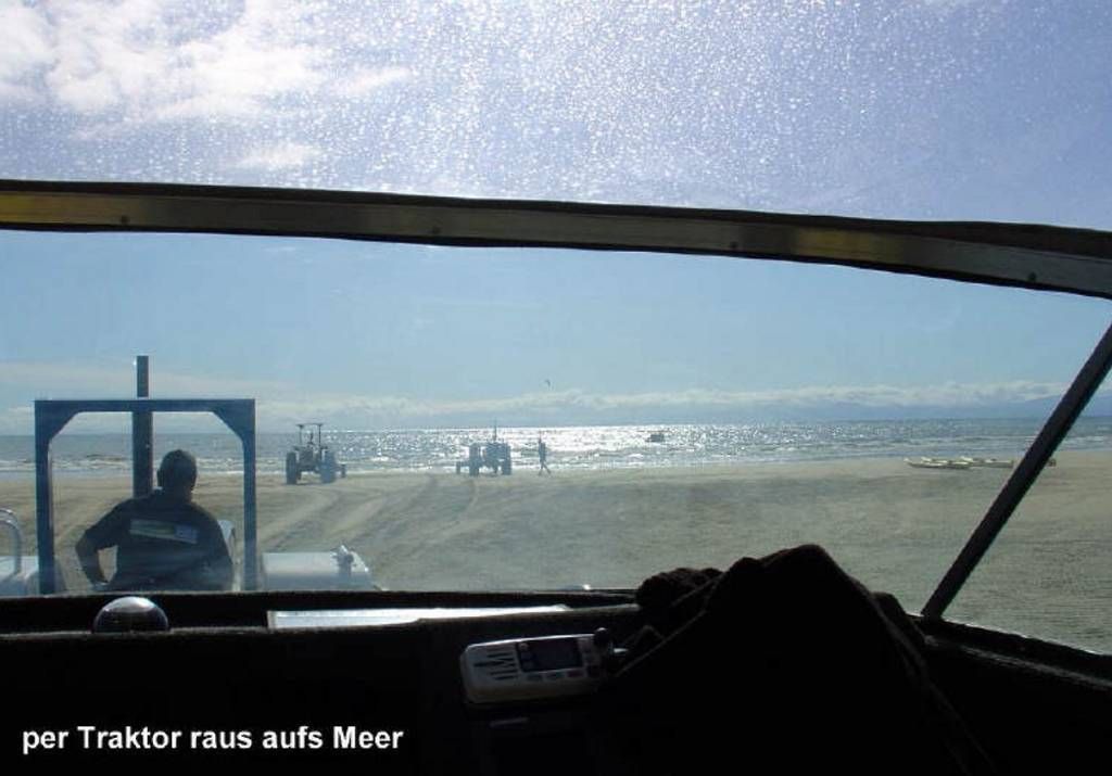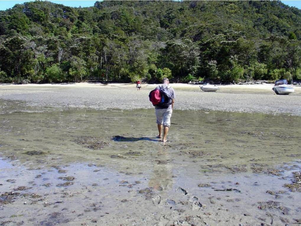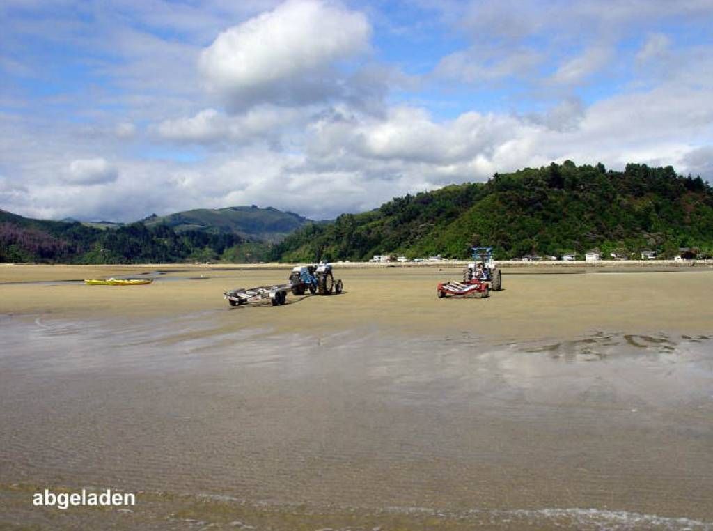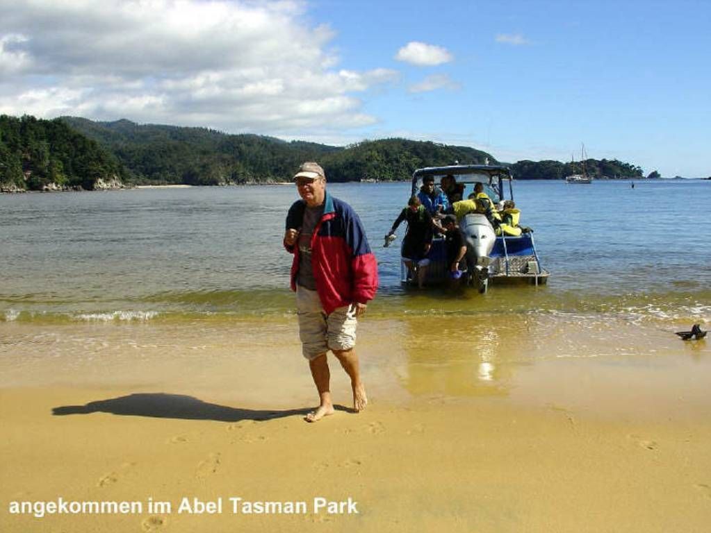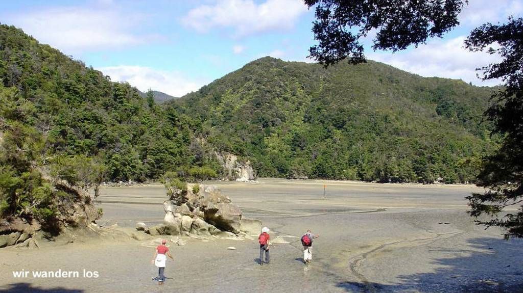 Um 8h45 sitzen wir auf einem Speedboot, das auf einem Anhänger liegt und an einem Traktor festgemacht ist. Wir sind 20 Personen, plus Paul, unser Wassertaxifahrer. Unter anderem sitzt da auch ein Paar aus Bellach, SO. Wir müssen alle gelbe Schwimmwesten anziehen und dann werden wir, bei Ebbe, mit dem Traktor weit über den Strand ins Meer gezogen. Das Boot wird ausgeklinkt und wir fahren ca. 45 Minuten bis zur Ancorage Bay. Von da laufen wir etwa 3 Stunden an der Küste entlang durch den Abel Tasman Nationalpark. Es ist wunderschön und auch das Wetter spielt mit. Weil Ebbe ist, können wir eine Abkürzung durch eine trockengefallene Bucht nehmen und durch den Schlick laufen. Trotzdem müssen wir 2 Mal unsere Wanderschuhe und Socken ausziehen um durch eiskaltes Wasser zu waten.