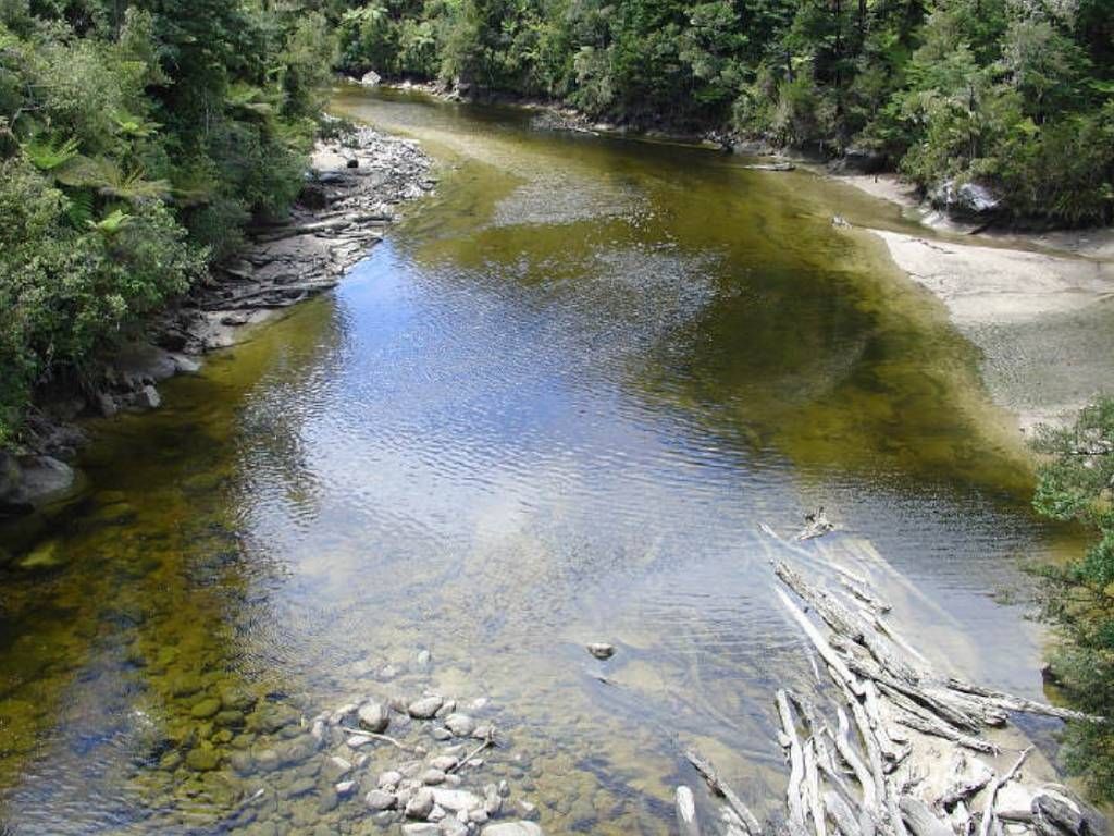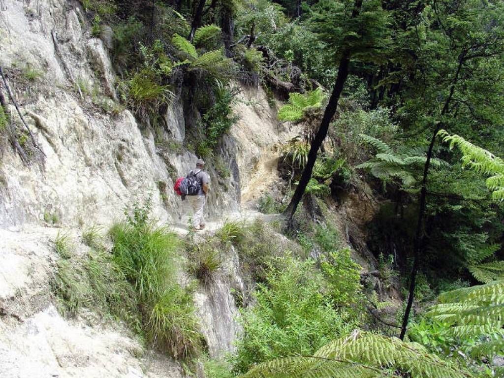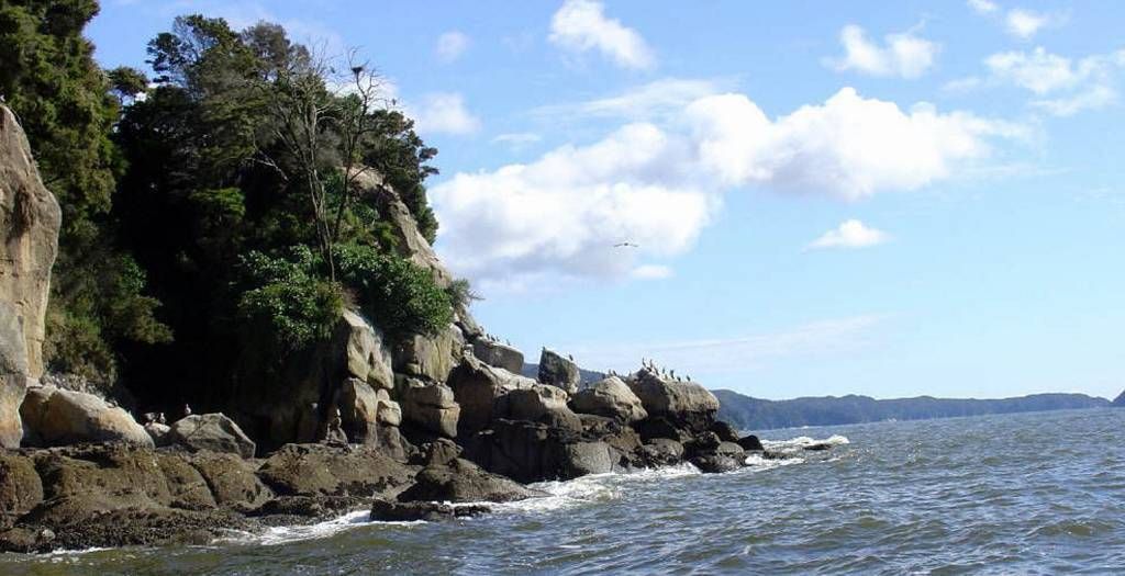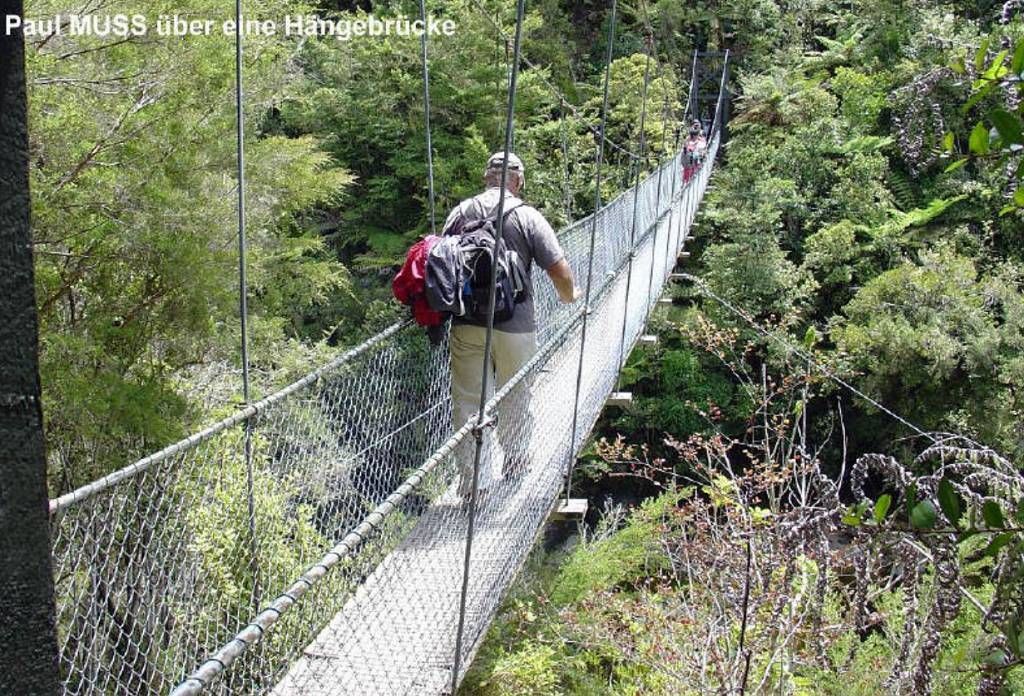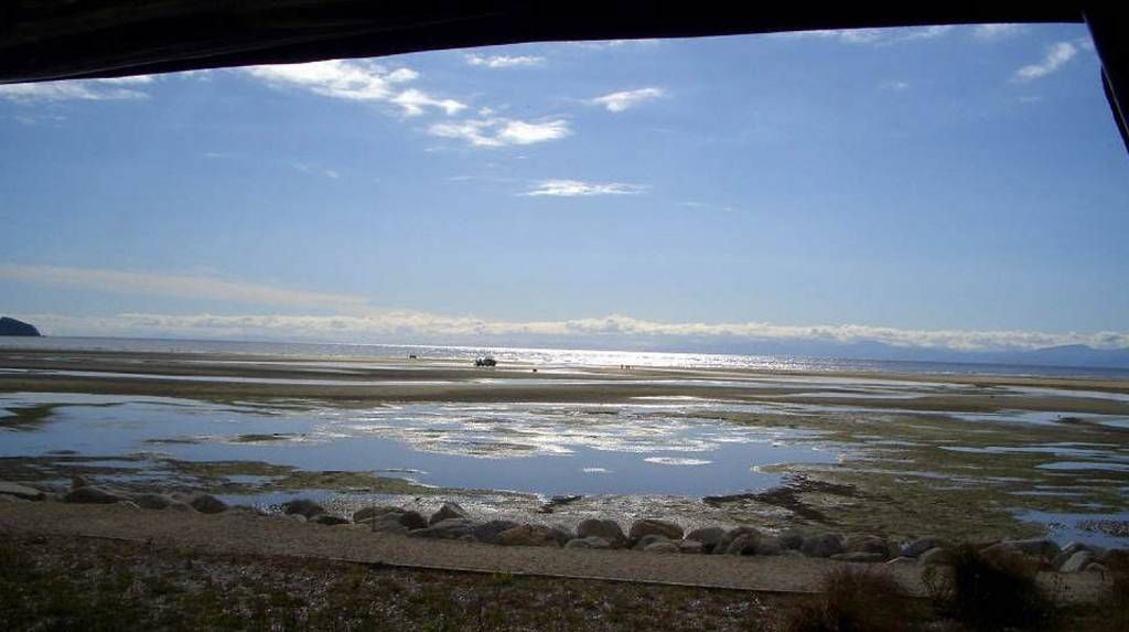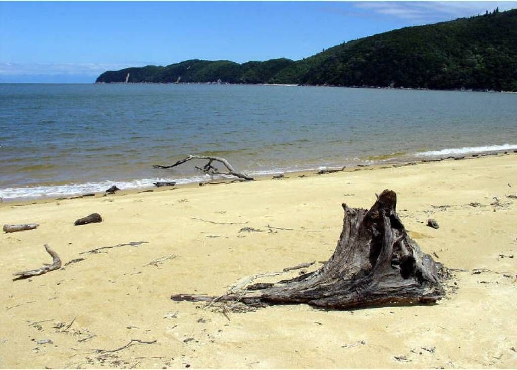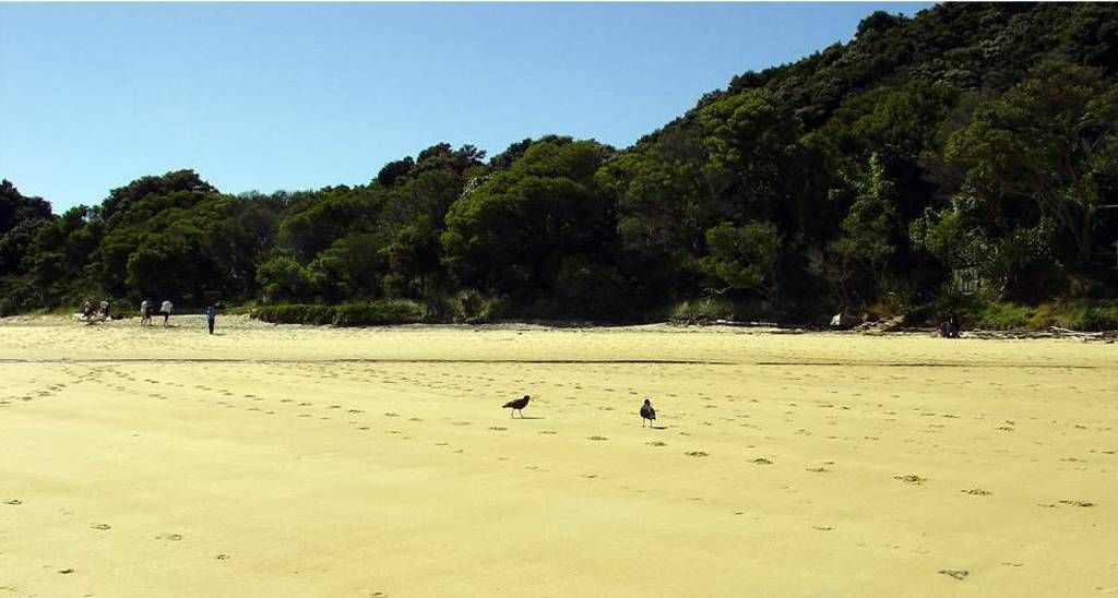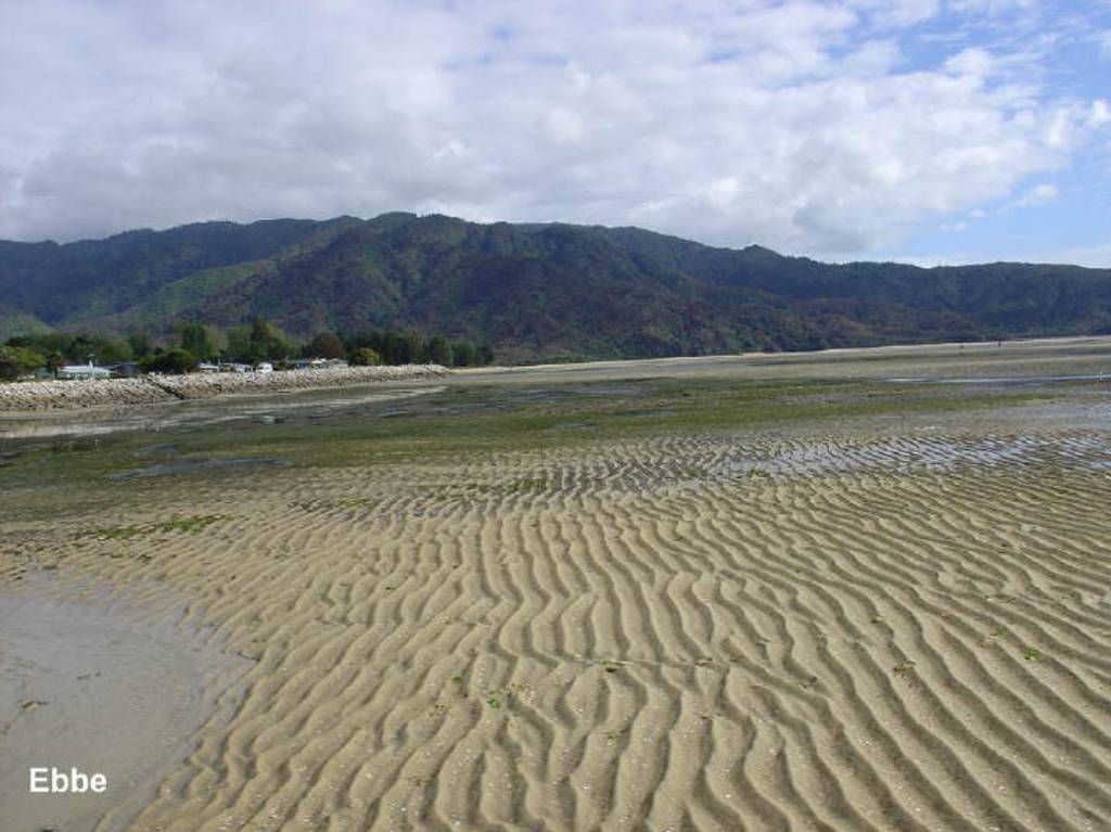 Um 8h45 sitzen wir auf einem Speedboot, das auf einem Anhänger liegt und an einem Traktor festgemacht ist. Wir sind 20 Personen, plus Paul, unser Wassertaxifahrer. Unter anderem sitzt da auch ein Paar aus Bellach, SO. Wir müssen alle gelbe Schwimmwesten anziehen und dann werden wir, bei Ebbe, mit dem Traktor weit über den Strand ins Meer gezogen. Das Boot wird ausgeklinkt und wir fahren ca. 45 Minuten bis zur Ancorage Bay. Von da laufen wir etwa 3 Stunden an der Küste entlang durch den Abel Tasman Nationalpark. Es ist wunderschön und auch das Wetter spielt mit. Weil Ebbe ist, können wir eine Abkürzung durch eine trockengefallene Bucht nehmen und durch den Schlick laufen. Trotzdem müssen wir 2 Mal unsere Wanderschuhe und Socken ausziehen um durch eiskaltes Wasser zu waten.