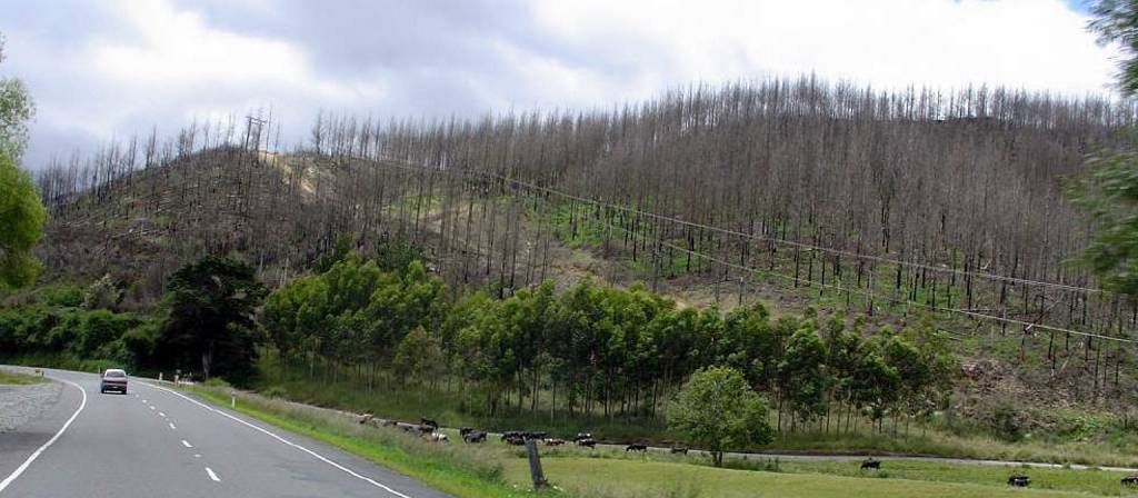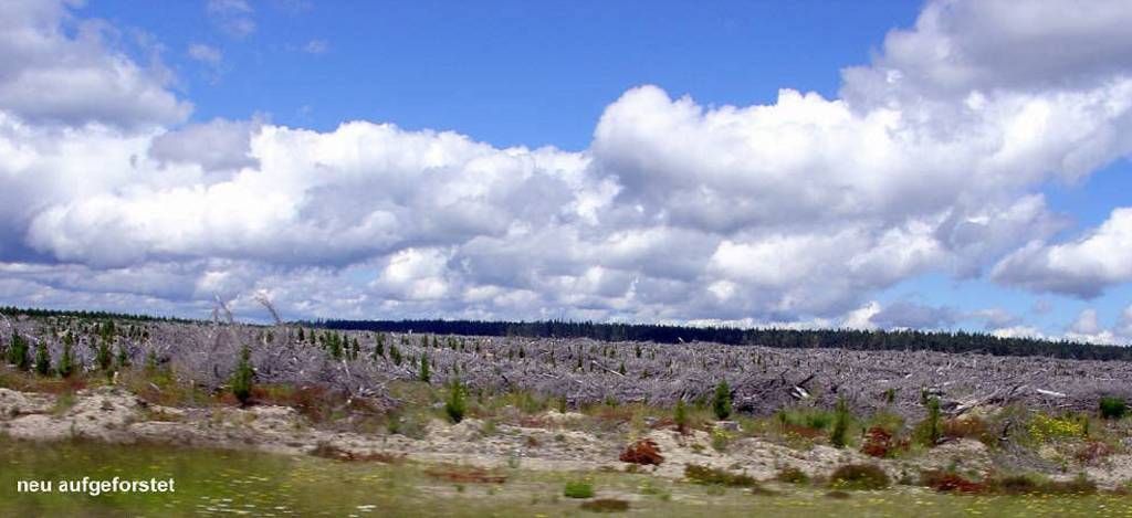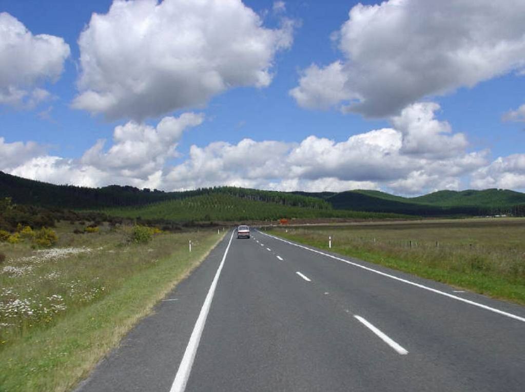 8h40 Abfahrt. Nach ca. 8km müssen wir schon wieder umkehren. Auf einer Tafel steht, dass die nächste Tanke 130 km entfernt ist. So weit kommen wir mit unserem 40 Liter-Tank nicht mehr. Sehr viele Obstbaumplantagen und Reben. Später Hügel und Berge mit unendlichen Fichtenwäldern, abgeholzter Wald und wieder aufgeforsteter Wald. Durch vulkanische Hügellandschaft mit gelbem Ginster, wunderschön!