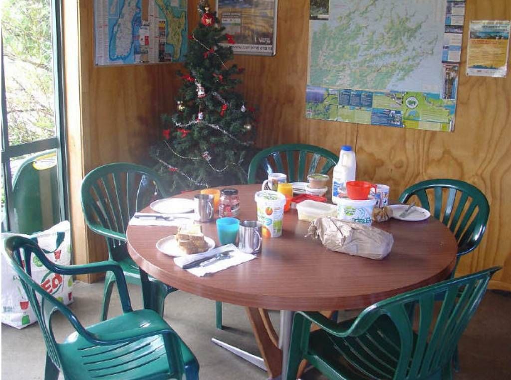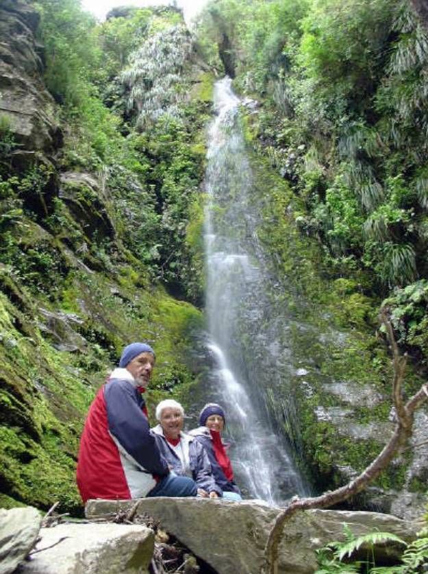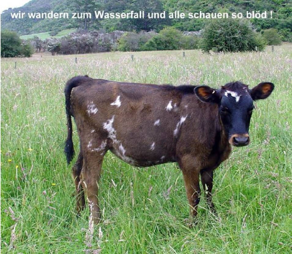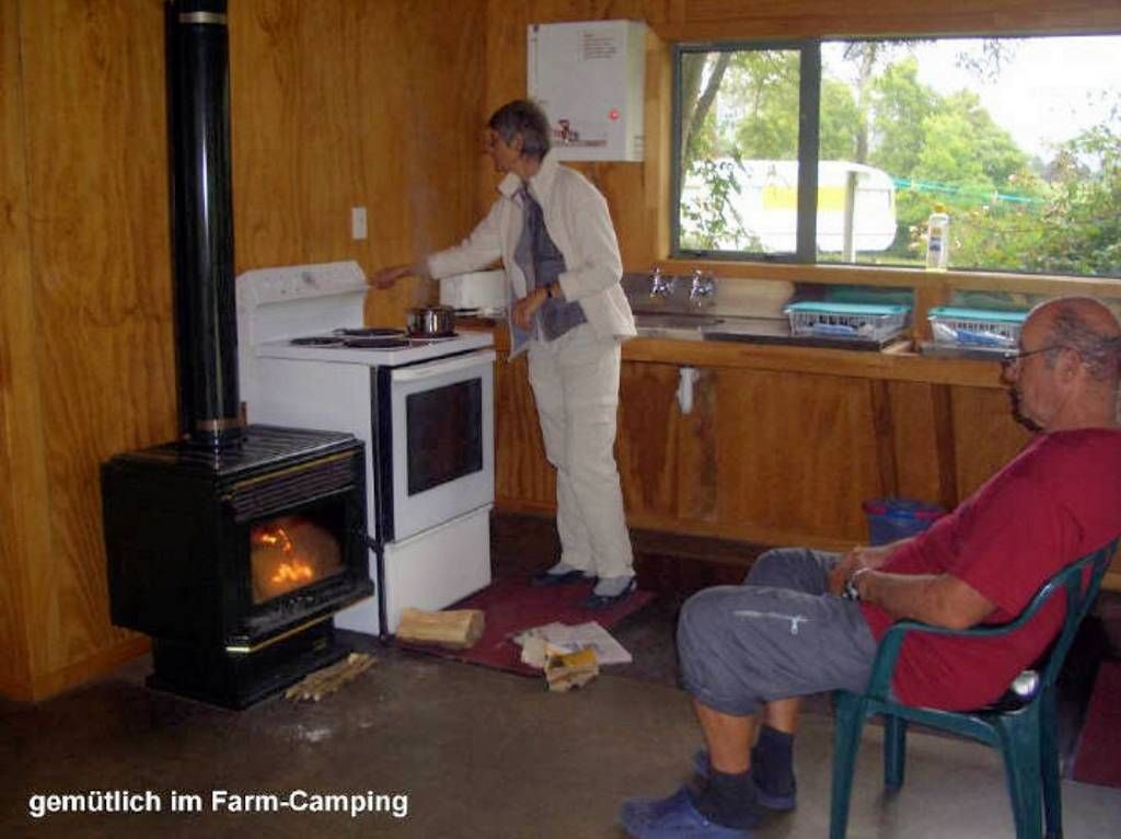 In Linkwater beziehen wir auf der Smith Farm Holiday Park unseren letzten Nachtschlafplatz auf der Südinsel. Beim Einchecken schenkt uns die Farmerin vier noch warme Muffins. Sie empfiehlt uns eine 1 ½ stündige Wanderung zu einem Wasserfall. Und die machen wir auch. Zuerst müssen wir durch die Weiden laufen, auf denen uns Kälber anstarren, als wenn wir vom Mond kämen. Die Wanderung und der Wasserfall sind sehr schön,obwohl das Wetter nicht mitspielt. Werner und Anne haben warme Mützen angezogen. Es regnet zwar nicht, ist aber dunkel bewölkt und sehr kalt. Wir sammeln kleines Holz und machen in der Gemeinschaftsküche im Kaminofen ein schönes, warmes Feuerlein. Das grobe Holz wurde vom Farmer bereitgestellt. Und nun ist es hier drin herrlich warm und gemütlich. Sogar ein schöner Weihnachtsbaum steht in der Ecke. Zum Essen gibt es heute gebratene Frikadellen, Kartoffeln und Salat.