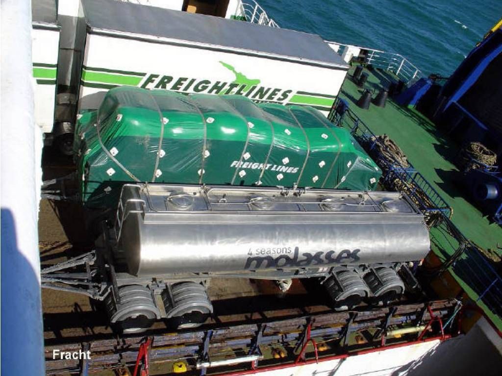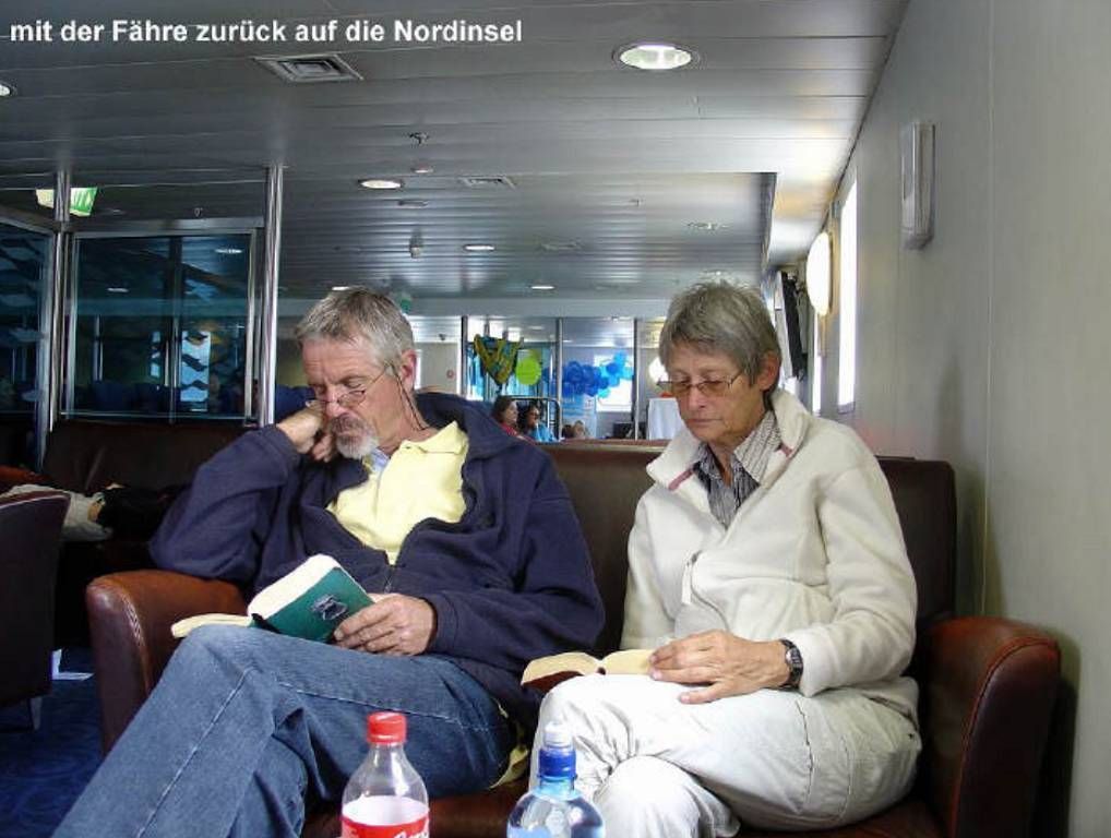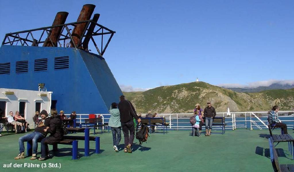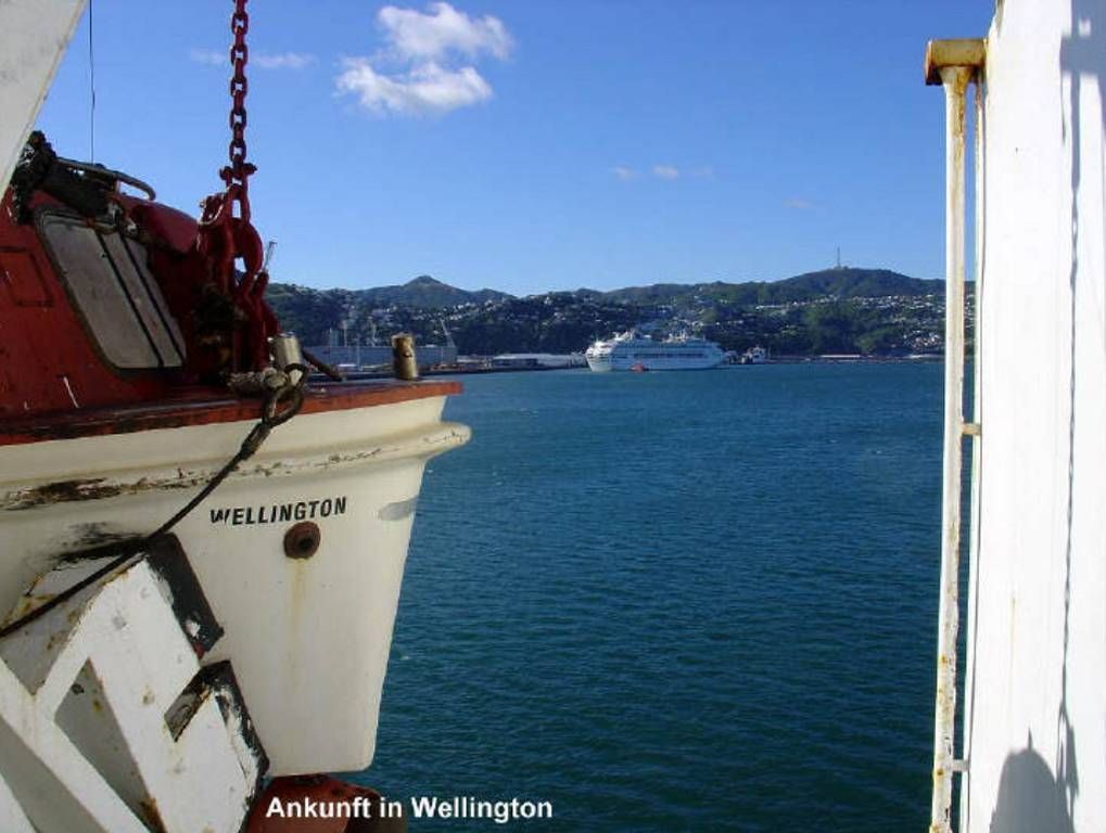 Um 14h15 fährt unsere Fähre der Firma Bluebridge los nach Wellington. Die „Santa Regina“, ist ein alter Kasten, fast ohne Fenster, um den wunderschönen Queen Charlotte Sound zu bewundern. Heute wo schönes Wetter wäre! Im etwas ungemütlichen Café essen wir zu Mittag. Fish n' Chips, dazu Salat und Tartarsauce. Paul wollte eigentlich einen Lammburger (steht auf der Speisekarte) haben. Aber es hat KEIN Lamm. Und das in einem Land wo es 44 Millionen Schafe gibt?