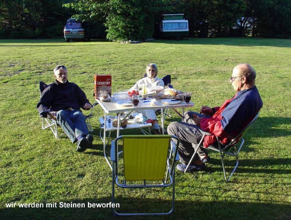 Danach sitzen wir herum, besprechen den weiteren Verlauf unserer Reise, lesen (oder dösen), trinken Kaffee und essen den mitgebrachten Kuchen aus der holländischen Bäckerei in Picton. Gegen 18h10 treffen wir in Wellington ein, mit über einer Stunde Verspätung. Wir fahren noch ca. 30 km bis zum Harcourt Holiday Park in Upper Hutt. Kaum haben wir parkiert, werfen Kinder von Containern auf dem Nachbargrundstück, Steine auf unsere Autos. Wir parkieren um, weiter entfernt, aber die Steine treffen uns immer noch. Nun gehen wir zum Campwart und beschweren uns.