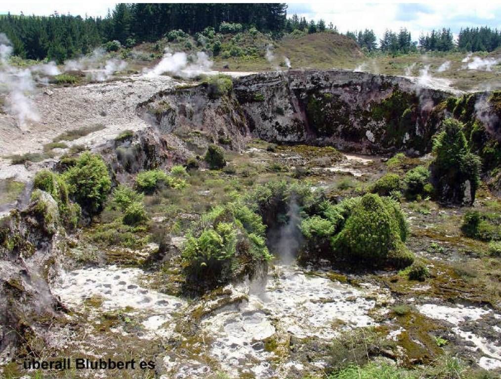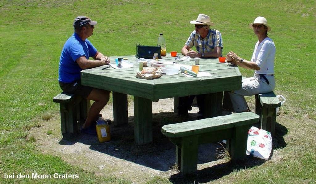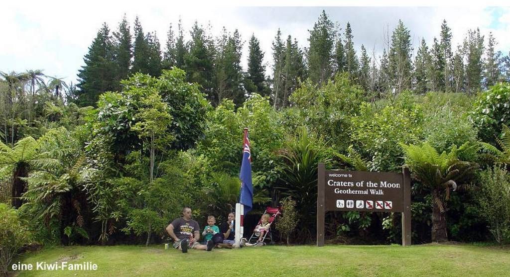 Bei den „Mond Kratern“ picknicken wir, bevor wir für 6$ den 45-minütigen Rundgang durch die Mondlandschaft in Angriff nehmen. Das ist sehr eindrücklich. Überall raucht und blubbert es aus der Erde. Erst um 15h45 geht unsere Fahrt weiter nach Rotorua. Wir bekommen einen sehr schlechten Platz für unsere Autos zugewiesen und reklamieren umgehend. Wir bekommen einen viel schöneren Platz und sind nun zufrieden. Na also, geht doch! Um 17h sitzen wir schon alle vier sehr entspannt im 38 - 40° heissen Thermalwasser-Pool des Kiwi Holiday Parks. Ah, ist das herrlich! Das könnten wir stundenlang aushalten! Danach kühlen wir uns im 29° warmen Swimmingpool ab und sitzen dann schon wieder im heissen Thermalwasser.