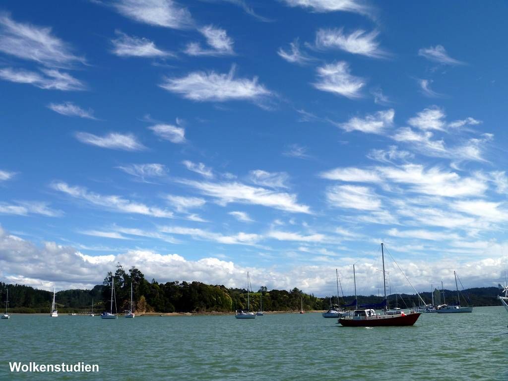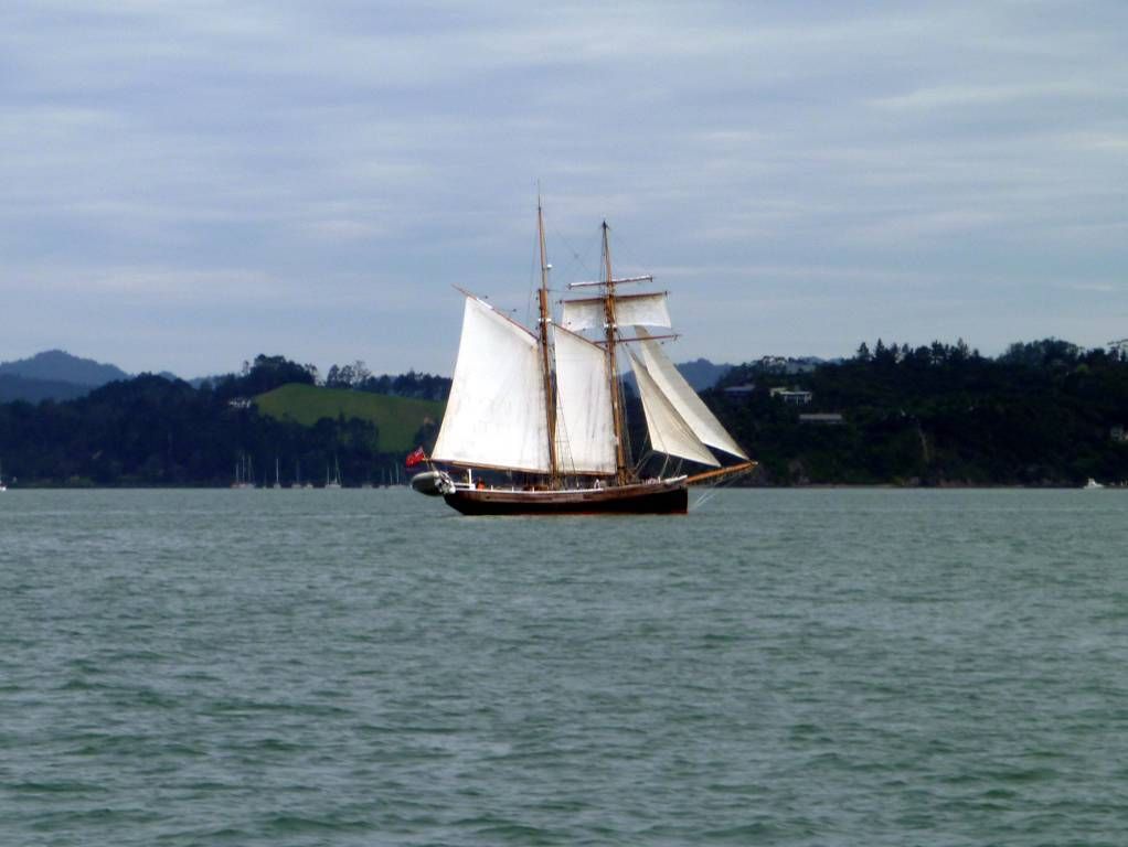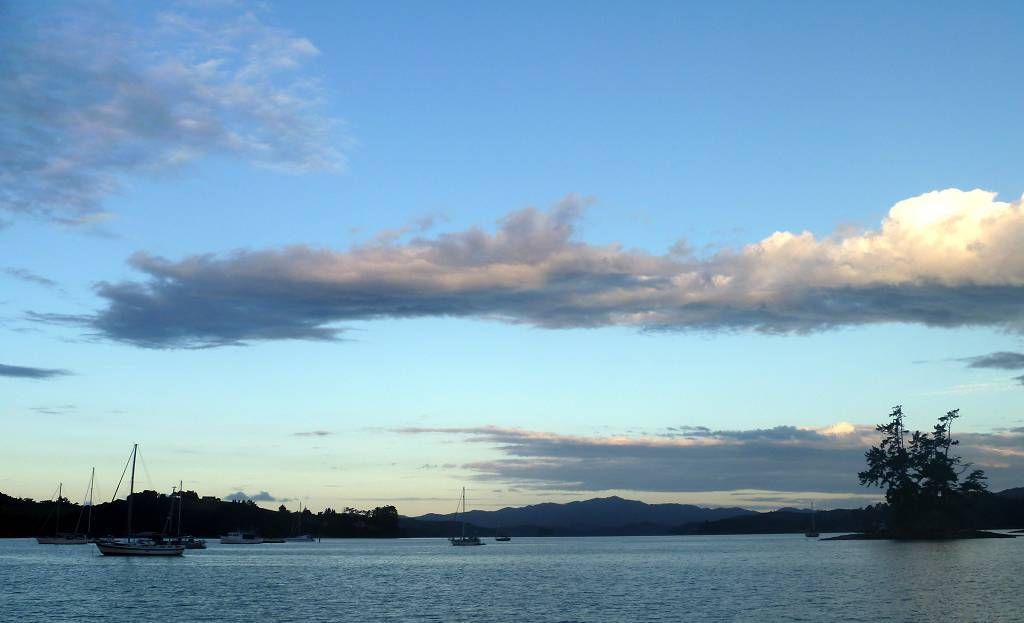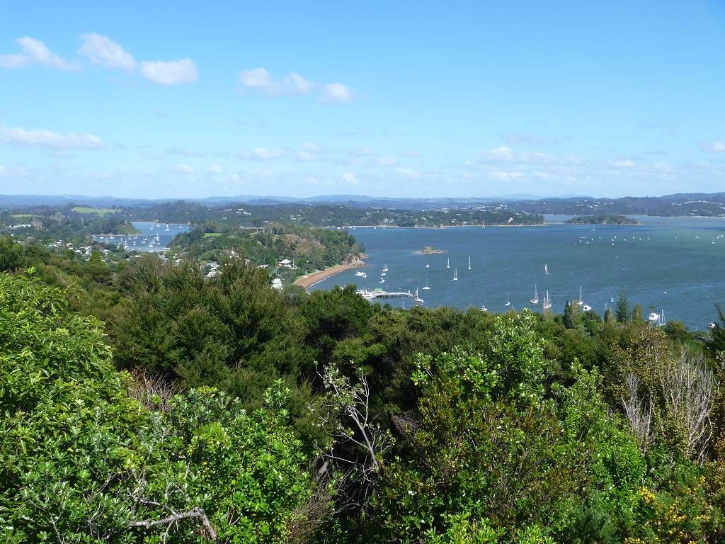 Um 11h15 sind wir bei der Fähre die auf die andere Seite der Bucht, auf die Halbinsel von Russel fährt. Die Fähre hat schon abgelegt, senkt aber die Auffahrtsrampe extra für uns wieder ab, damit wir noch mitfahren können. Toll! Angekommen rufen wir Eric von der „Aroha“ an. Er holt uns mit seinem Auto ab. Eigentlich wollten wir ja laufen, aber es sind immerhin 8 km. Im schönen Ort Russel treffen wir Monika, Antje und Holger. Wir kaufen ein Sandwich um es am Strand zu essen. Zusammen spazieren wir, jeder mit einer Glacé in der Hand, dem Meer entlang und auf einen Hügel um die schöne Aussicht zu geniessen. Das Wetter ist ziemlich durchzogen. Auf dem Rückweg kaufen die Frauen ein paar Souvenirs (ich eine warme Fleecejacke) ein und die Männer warten geduldig vor der Tür. Inzwischen sieht es immer mehr nach Regen aus und Paul möchte „nach Hause“. Aber Holger und Eric überzeugen ihn, dass wir noch auf der „Aroha“ zusammen zu Abend essen. Monika kocht ein feines Chili con Carne und zum Dessert gibt es einen Kuchen von Antje. Und nun regnet es wirklich. Vom Segelclub findet hier jeden Mittwochabend eine Regatta statt und wir können zuschauen, wie ein kleines Boot dabei kentert. Aber die Segler können das Boot selber wieder aufrichten. Nach dieser Vorstellung bringt uns Eric mit dem Dinghy ans Ufer und mit dem Auto zur Fähre, Gegen 19h30 sind wir wieder zu Hause auf der MABUHAY. Die Wäsche ist nicht wirklich trocken.