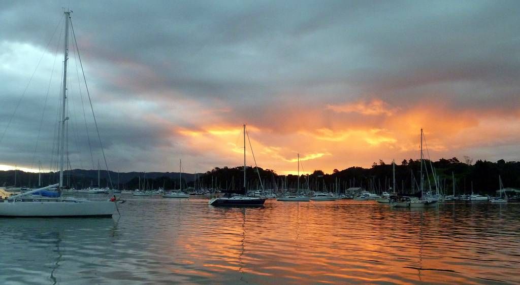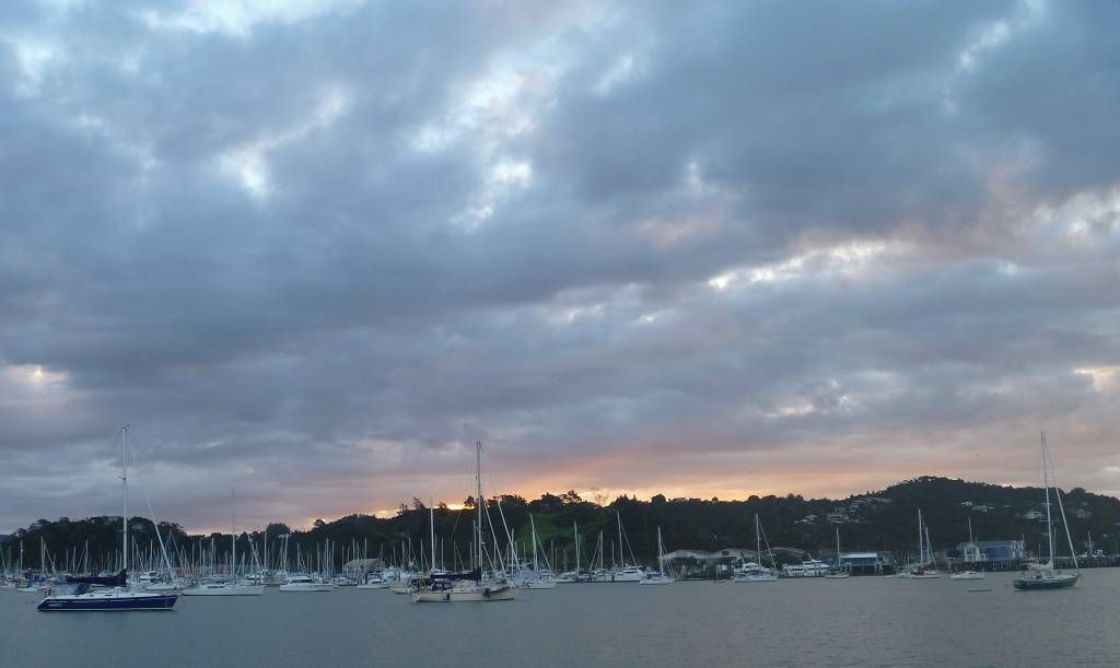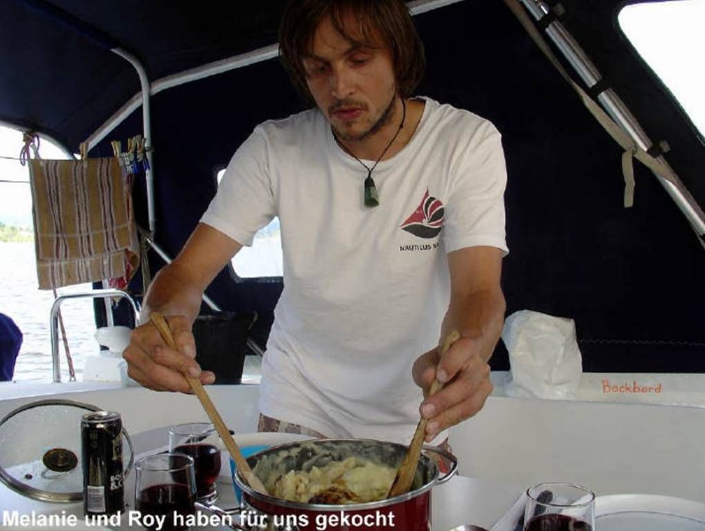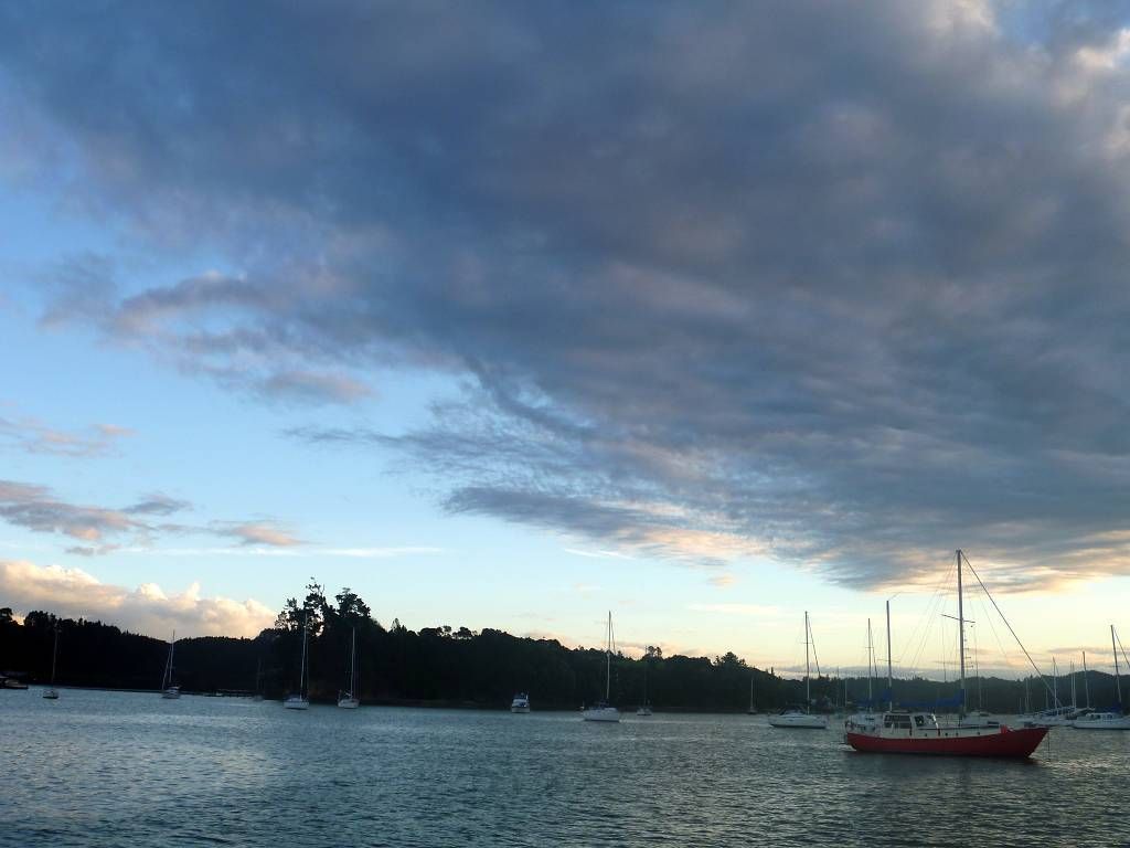 Um 17h holt Paul Oliver und Daniel von der „Yellow Dog“ ab. Wir haben sie zu uns eingeladen. Paul hatte mit Oliver in Bora Bora eine Wette abgeschlossen, dass in Neuseeland der Strom 110 Volt hat. Er hat die Wette verloren, hier hat man 230 Volt! Und anstatt die Kiste Bier zu kaufen, um die sie gewettet haben, laden wir die beiden jetzt zu einem Spaghettifuttern ein. Es ist sowieso zu kalt für Bier! Ausserdem sind die beiden mit ihrem Schiff an Land am Unterwasseranstrich anstreichen und sind vielleicht froh, nicht kochen zu müssen. Den ganzen Nachmittag weht ein zünftiger Wind. Abends ist es herrlich windstill. Paul bringt Daniel und Oliver um 23h per Dinghy zurück an Land.