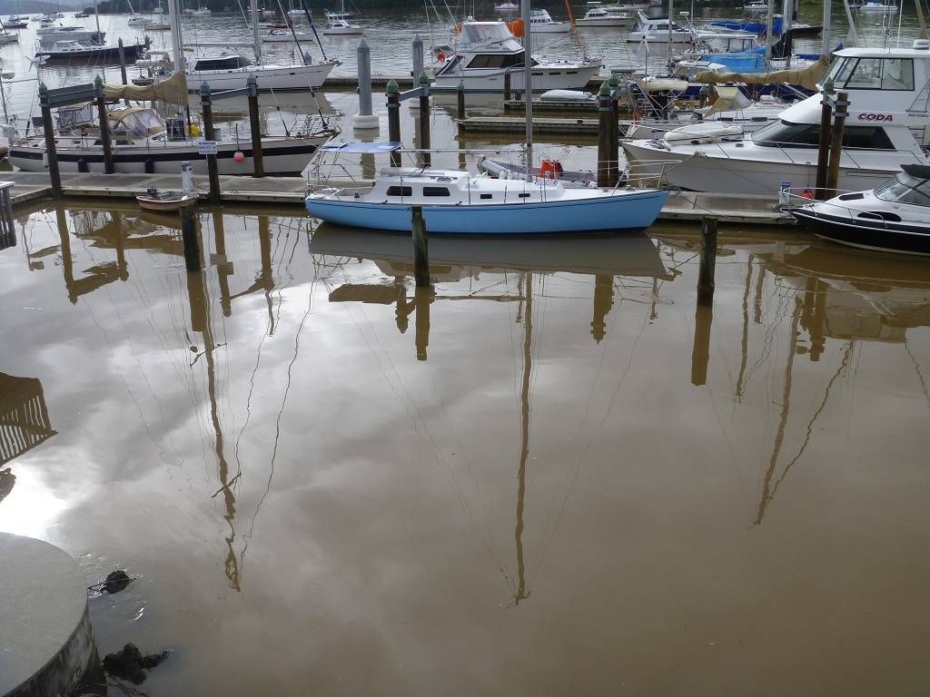 Juhu, es regnet nicht mehr und zwischendurch schaut sogar die Sonne hervor. Wir schlafen bis um 11h (!!!) im Auto auf dem Marina-Parkplatz und fahren danach mit dem Dinghy zur MABUHAY hinüber, wo es um 12h (!!!) Frühstück gibt. Das fängt ja schon wieder gut an, dieses neue Jahr! Wir beobachten, wie ein gesunkener Steg erfolglos abgeschleppt wird. Von dem ewigen Regen und dem Gewitter von Freitagnacht ist das Wasser der ganzen Bucht total braun und grauslich.