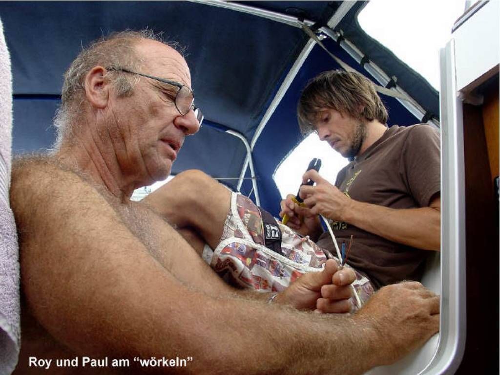 Auch heute wieder Sauwetter! Regen und dazu Wind, in Böen bis zu 30 Knoten. Paul werkelt dies und das im Schiff herum. Hauptarbeit heute: Ölwechsel am Motor, nicht gerade eine Sonntagsbeschäftigung, meine ich. Aber mein Bordmechaniker findet, dies sei genau das richtige Wetter für diese Arbeit. Ich muss ihm zwischenzeitlich assistieren und endlich mal alle Mailschulden abarbeiten und weiter am Bericht schreiben.