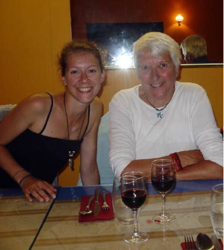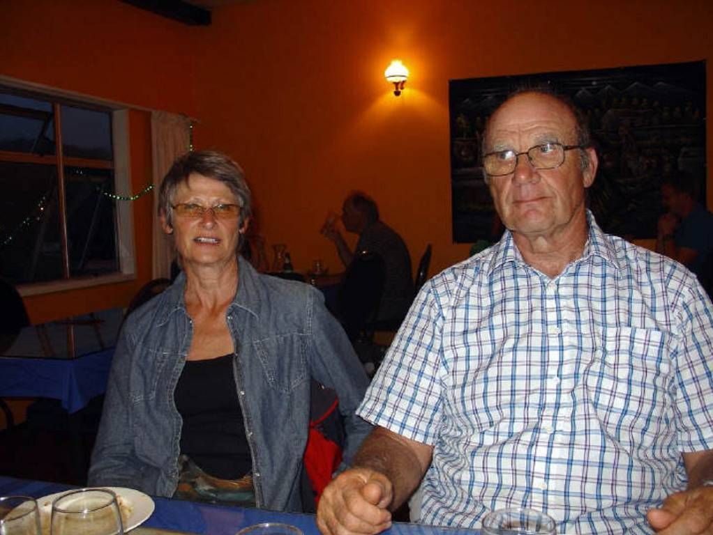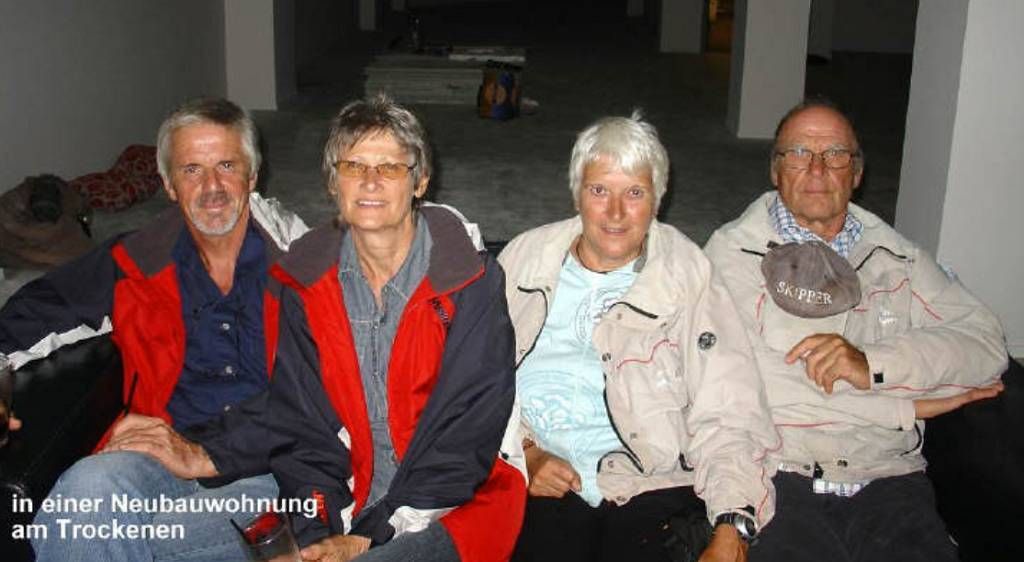 Wir haben vor ihrem Häuschen in unserem Auto geschlafen und frühstücken mit Anne und Werner. Die Sonne scheint, es ist leicht bewölkt.
