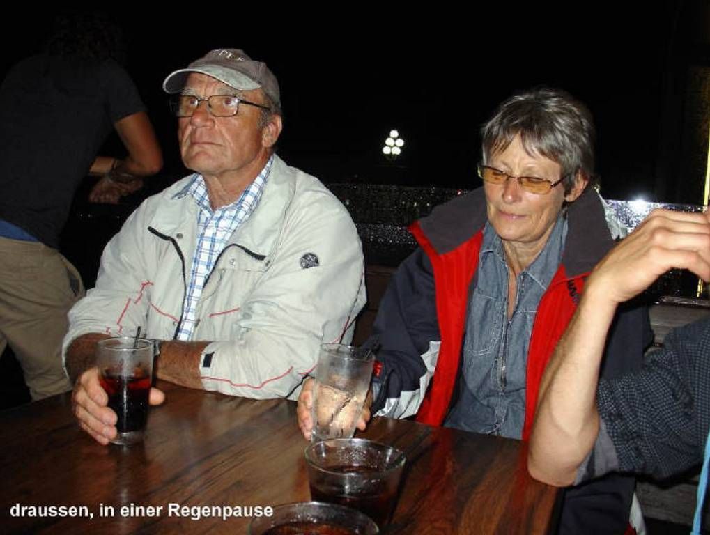 Heute montieren Roy und Paul wieder ein Kabel an den 6-fach-Schalter. Diesmal ist es ein Kabel für das neue Ankerlicht am Heck. Und: es regnet immer wieder! Nur der Wind hat merklich nachgelassen, meinten wir. Den ganzen Tag Regen, Regen, Regen! Wir sind schon alle ganz depressiv und genervt. Um 15h ruft uns Eric von der „Aroha“ über Funk. Sie sind im Marina Café und möchten uns treffen. Wir fahren in einer Regenpause per Dinghy an Land. Melanie und Roy wollen nach Paihia einkaufen und danach will Roy trotz Regen kiten gehen. Paul und ich treffen uns im Café mit Eric, Monika, Antje und Holger zu einem Kaffee. Die Vier liegen mit ihren Schiffen vor Russel, in der gegenüberliegenden Bucht. Sie sind mit der Fähre herüber gekommen. Später kommen noch Anne und Werner dazu. Weil Freitag ist, gibt es ab 18h Livemusic. Diese ist (für unseren Geschmack) so scheusslich und laut, dass eine Unterhaltung nicht mehr möglich ist. Wir lösen die Runde schleunigst auf.