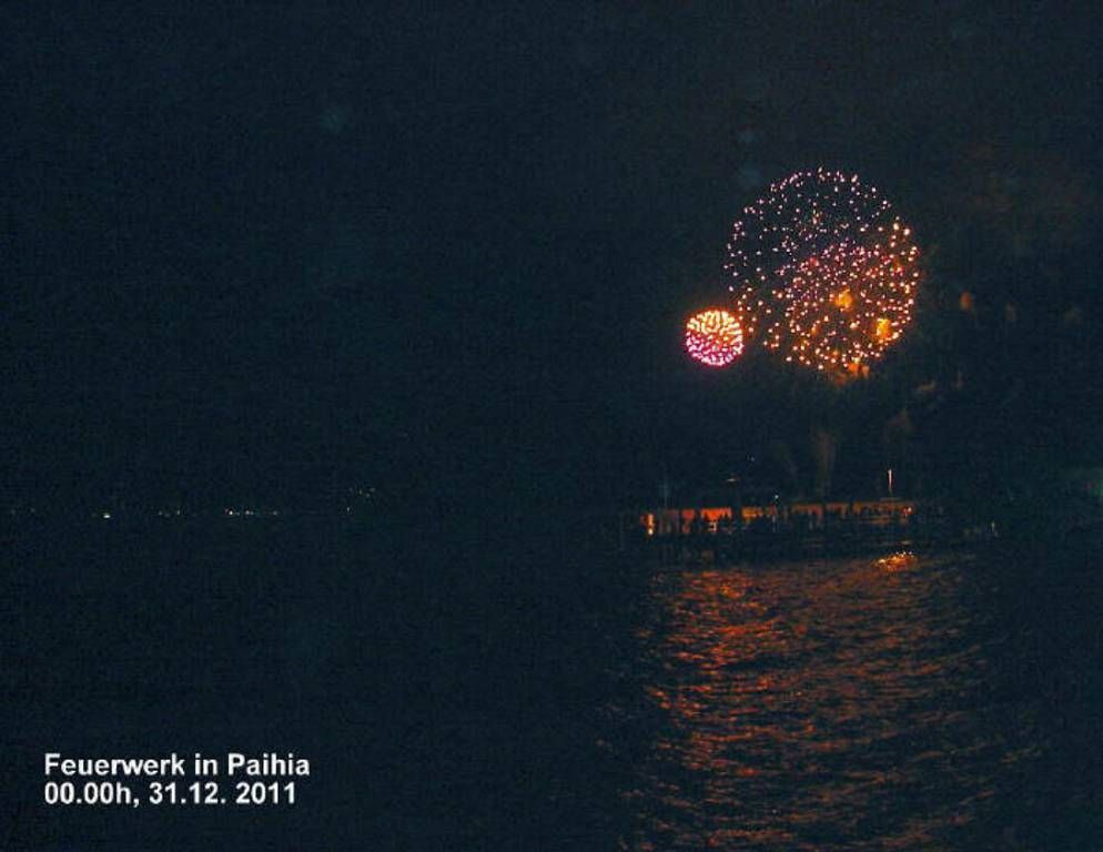 Endlich, gegen 14h hört der Regen auf und die Sonne kommt ganz zaghaft hervor. Wir fahren alle vier mit dem Dinhgy zum Duschen zur Marina rüber. Wir machen einen kleinen Einkauf im Lebensmittelladen und schauen dem Betrieb der Fähre zu. Anschliessend essen wir zu viert zwei Portionen Pommes Frites im Marina Café. Bis wir wieder auf der MABUHAY zurück sind, regnet es schon wieder. Um 19h30 treffen wir uns mit Anne und Werner beim Auto und fahren alle zusammen in unserem „Popey-Auto“ zum Essen nach Paihia. Beim Inder essen wir, für unseren (ausser Roy) Geschmack, viel zu scharfe, aber trotzdem feine Sachen mit Reis. Dazu trinken wir weissen und roten Wein, den Paul und Roy schnell in einem Alkoholladen kaufen gehen. „BYO“ steht auf der Speisekarte! Das ist ein Zauberwort und heisst: „bring your own“ (bring das Getränk selber mit). Allerdings muss man pro Flasche, die man selber mitbringt am Schluss 5 $ (ca. 3.50 SFr.) (für Gläser und Entsorgung) bezahlen. Wir finden das fair! Während wir gemütlich im Warmen und Trockenen essen, schüttet es draussen mehrmals. Aber das scheint den Kiwis nicht viel auszumachen. Als wir gegen 22h30 das Restaurant verlassen, regnet es zwar im Moment nicht, aber es weht ein sehr kühler Wind. Draussen herrscht grosses Getümmel. Die jungen Frauen tragen winzigste, dünne Fähnchen von Sommerkleidchen, sehr mini und sehr schulterfrei..., es ist ja schliesslich Sommer, sagt man uns immer wieder. Dazu tragen sie Gummistiefel oder sehr viele sind barfuss. Anne, Melanie und ich schlottern in unseren Jeans und Regenjacken. Wir flüchten in ein Restaurant mit Lifemusic, im 1. Stock, auf die Terrasse. Paul und Roy trocknen für uns einen Tisch, Bank und Stühle ab. Bis wir uns alle gemütlich niedergelassen haben, fängt es wieder an zu regnen. Wir flüchten erneut. Diesmal in eine noch unfertige Neubauwohnung, auf dem gleichen Boden wie das Restaurant. Hier scheint eine private Party im Gange zu sein. Wir setzen uns auf eine alte Couch die herum steht und schauen dem Treiben zu. Wir haben das Gefühl, in der GANZEN Stadt die ältesten GRUFTIES zu sein....Draussen auf dem Balkon ergreift ein Windstoss den zipfeligen Rock einer jungen Frau und ausser eines Schnürchens von einem Stringtanga trägt sie gar NICHTS darunter! Es folgt ein grosses Gejohle!!! 15 Minuten vor Mitternacht schmeisst uns der (vermutliche) Wohnungsbesitzer alle raus, die nicht zu seiner Party gehören. Somit natürlich auch uns sechs. Nun begeben wir uns nach unten an den Strand und Punkt 00h findet das Feuerwerk statt, weswegen wir eigentlich hierher gekommen sind. Nach 8 Minuten ist das sehr schöne Spektakel vorbei und wir machen uns auf den Rückweg nach Opua. Paul chauffiert uns souverän zurück. Anne und Werner gehen zu ihrer „sail away“, Melanie und Roy, Paul und ich schlafen in unseren Van's auf dem Marina Parkplatz.