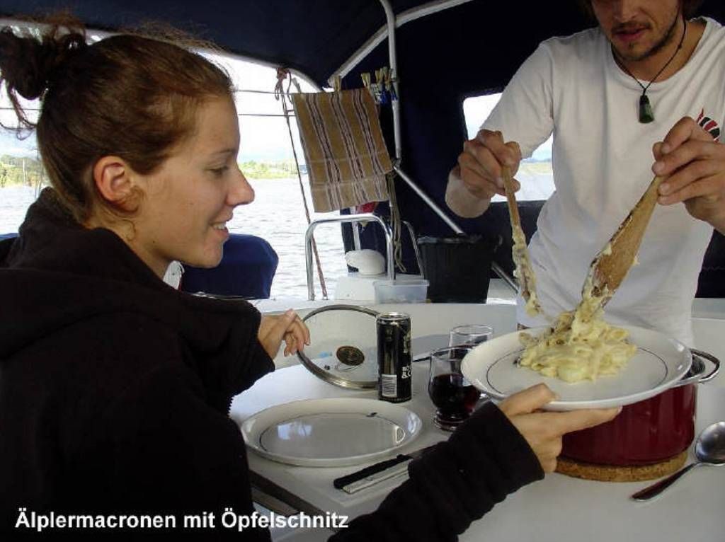 Zum Abendessen bekochen uns Melanie und Roy mit „Älplermakronen“ mit ganz viel Käse und dazu „Öpfelschnitze“. Mmmm..., schön einmal nicht kochen zu müssen!