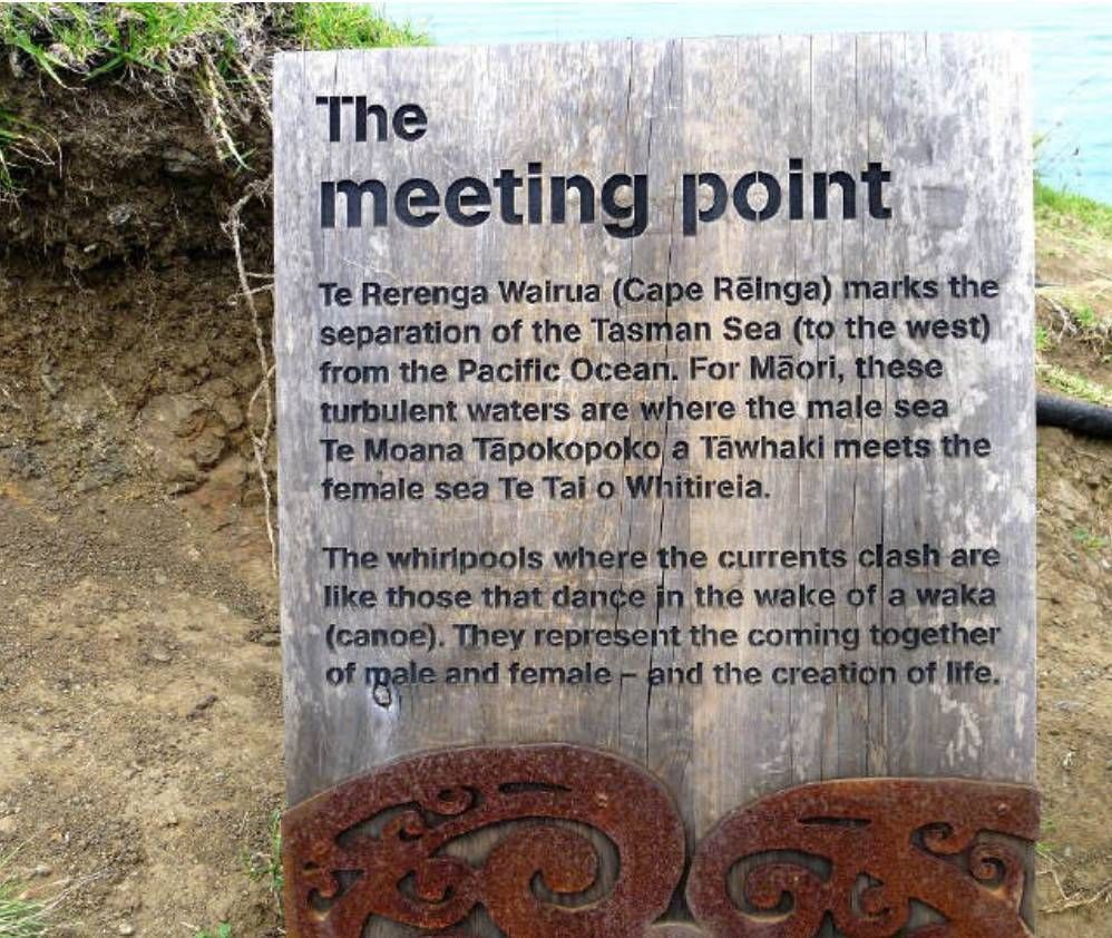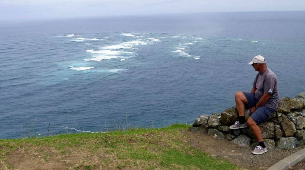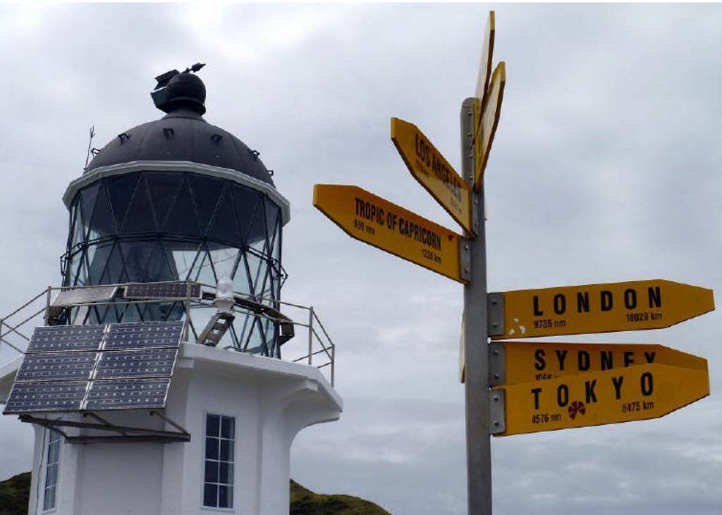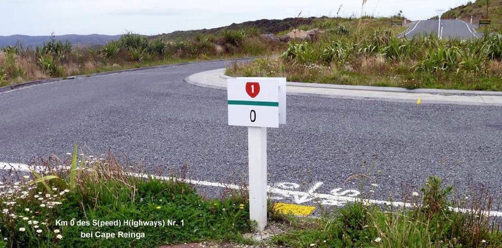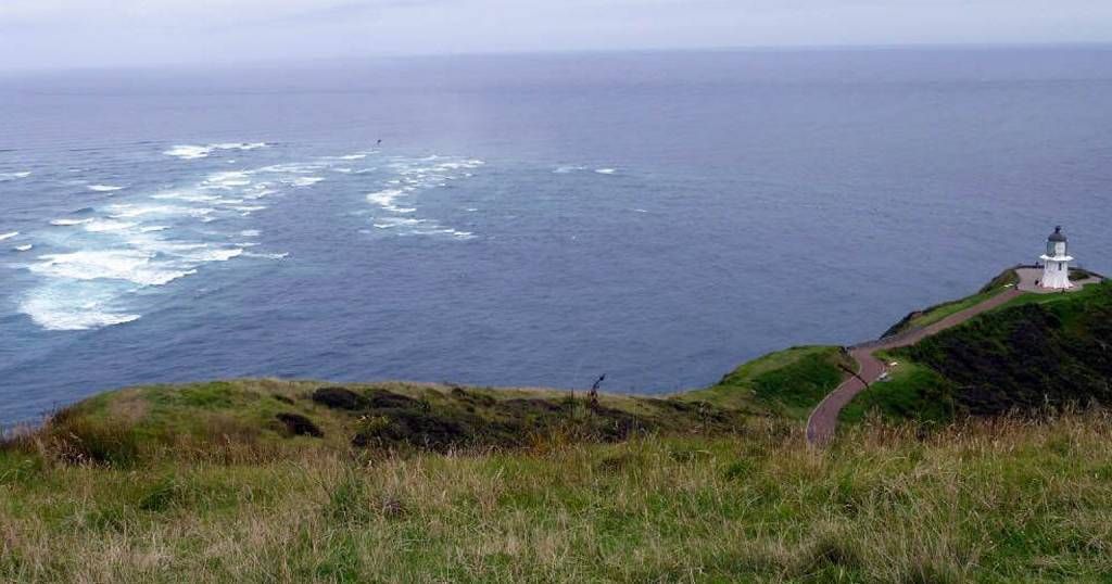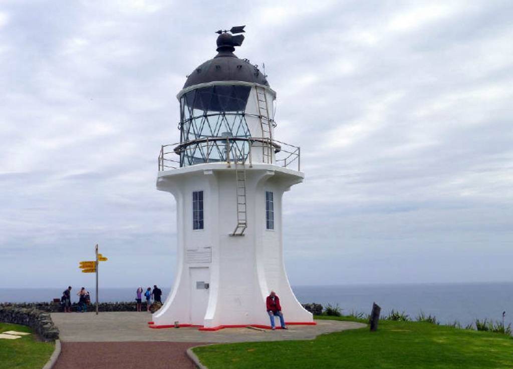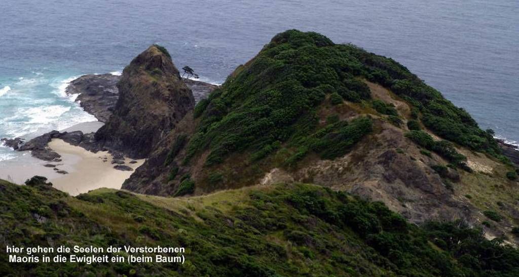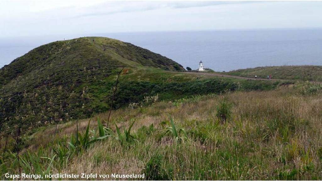 9h15 los. Total bedeckter Himmel. Wir fahren weiter nordwärts, bis zum Cape Reinga, dem nordwestlichsten Zipfel von Neuseeland. Die Sonne scheint wieder. Wir laufen gemütlich zum schönen Leuchtturm am Ende der Halbinsel. Hier ist der Ort, wo die Seelen der verstorbenen Maoris in die Ewigkeit eingehen. Hier ist auch der Punkt, wo die Wellen der Tasmansee und die Wellen des Pazifiks aufeinander treffen. Heute ist das Meer sehr ruhig und trotzdem sieht man das sehr gut.
