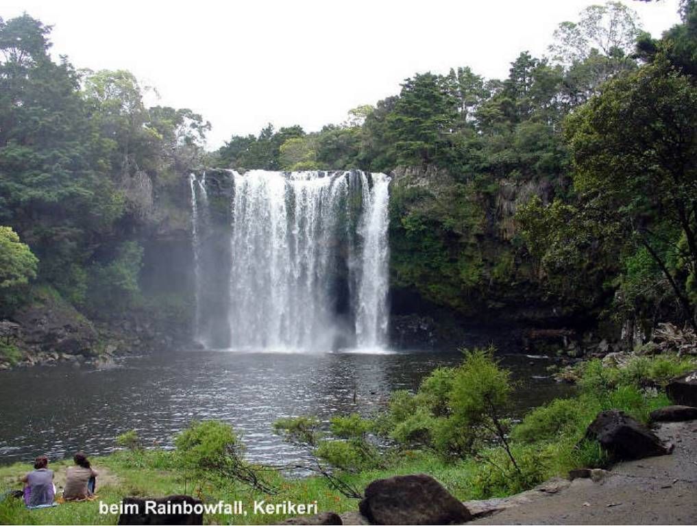 Um 10h sind wir in Kerikeri beim Häuschen von Anne und Werner. Zusammen fahren wir in Werner's Auto durch Kerikeri zum Ausgangspunkt der Wanderung zu den Rainbowfalls. Ein Weg dauert eine Stunde und ist ganz bequem und gemütlich zu erwandern. Und der Wasserfall ist wirklich gewaltig. Da haben wir schon ganz andere gesehen, die nur so müde vorsichhintröpfelten. Ein paar ganz verwegene junge Frauen schwimmen in dem Eiswasser vor dem Wasserfall herum!!!.