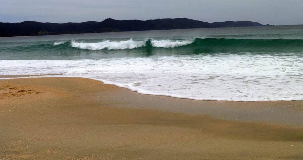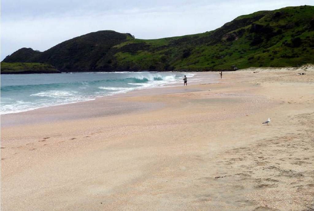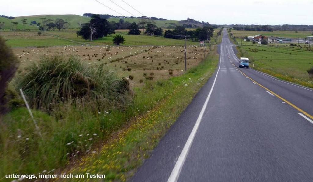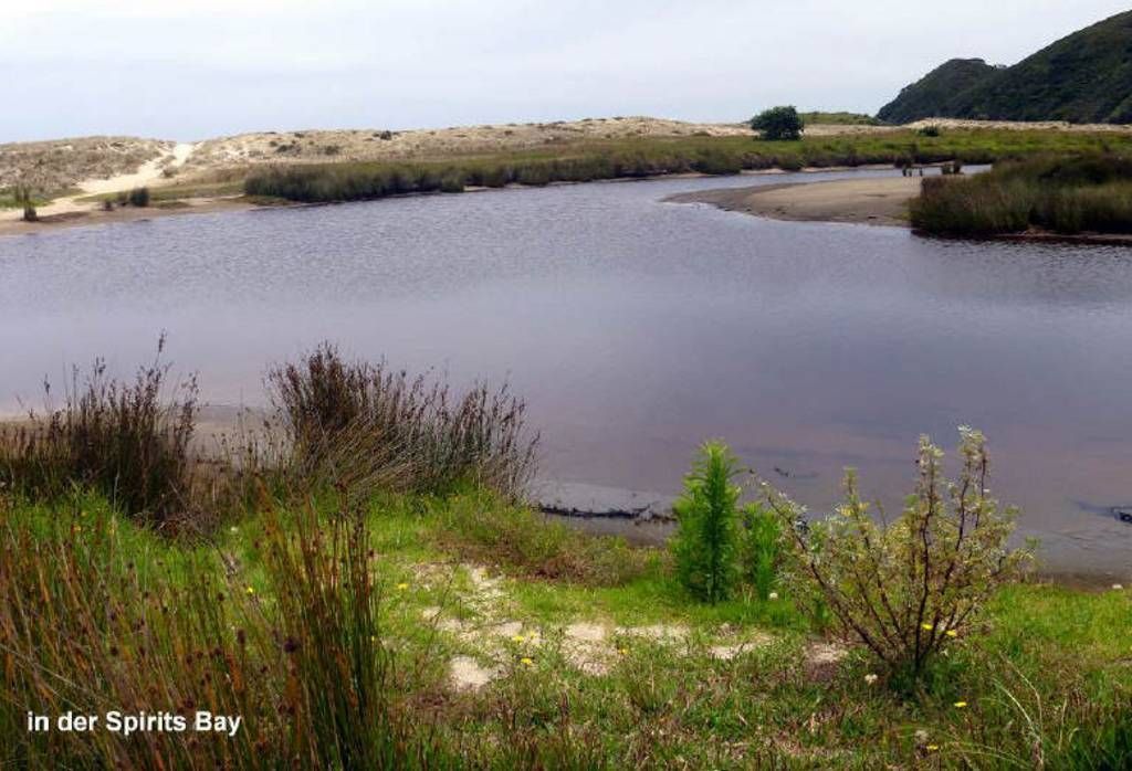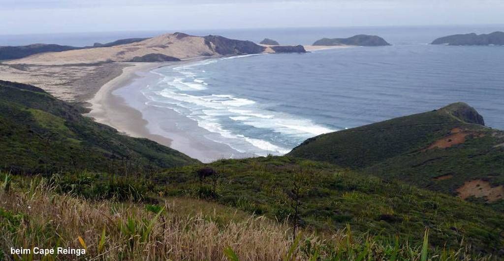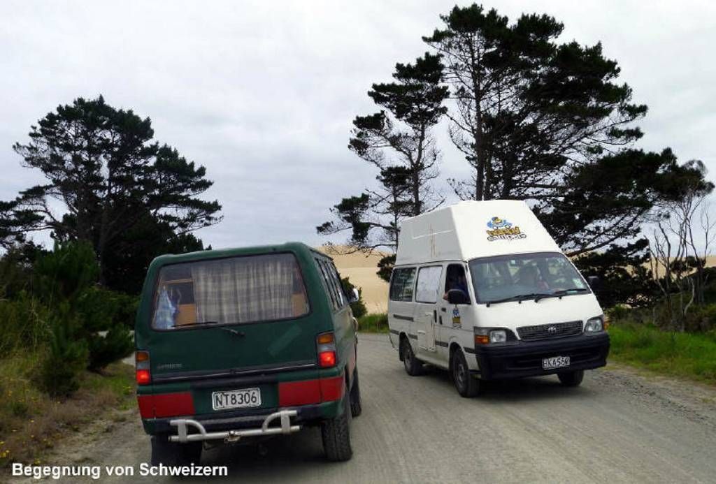 Auf dem Rückweg zur Hauptstrasse treffen wir wieder auf die Schweizer, die wir gestern kennen lernten. Mitten auf der Strasse halten die beiden Fahrer an und wir machen ein Schwätzchen. Weiter geht es wieder auf die Pazifikseite. Wir wollen eigentlich zum allernördlichsten Punkt von Neuseeland, aber wir finden den richtigen Weg nicht, oder es gibt gar keinen. Aber die Gegend die wir so „erfahren“ ist sehr schön, auch wenn es auf dieser „gravelroad“ (ungeteerte Strasse) nur so staubt. Beim Kapowairua Camp, in der Spirits Bay, spazieren wir zum Strand. Und wer ist schon wieder da??? Ja genau, die beiden Schweizer vom Bodensee. Jetzt erfahren wir, dass sie Ursula und Peter heissen. Hier an diesem Strand sehen wir die allerschönsten Wellen für Surfer.