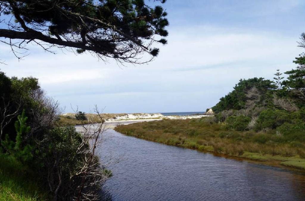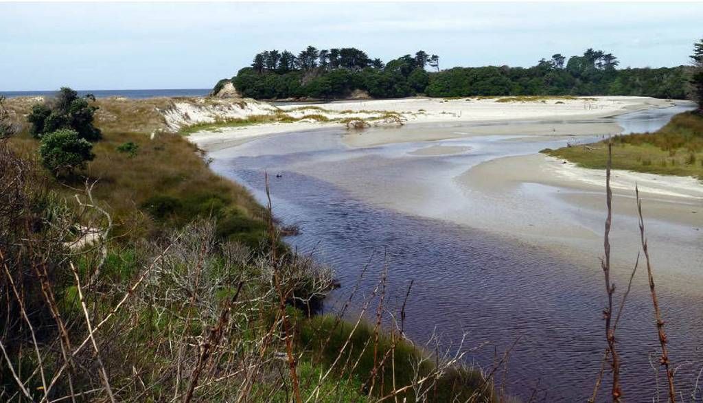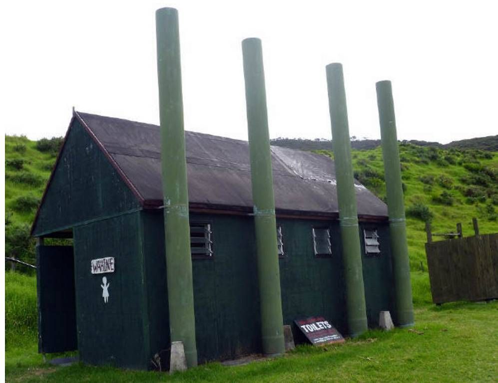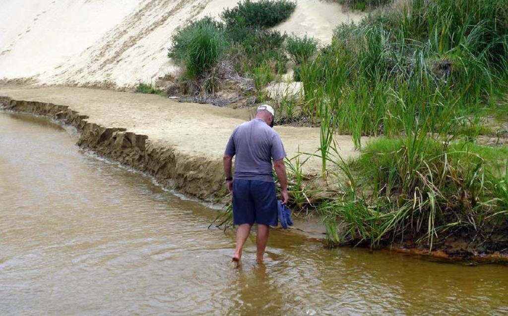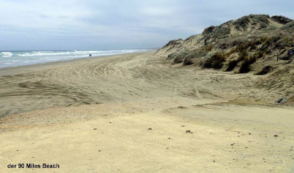 Die Lage dieses Camps wäre wunderschön! Direkt am supertollen Sandstrand der Tasmansee, wo aber wieder Autos darauf herumfahren. Wozu ist das gut? Wir machen einen langen Strandspaziergang und duschen danach kalt in einer grausligen, verdreckten Dusche.