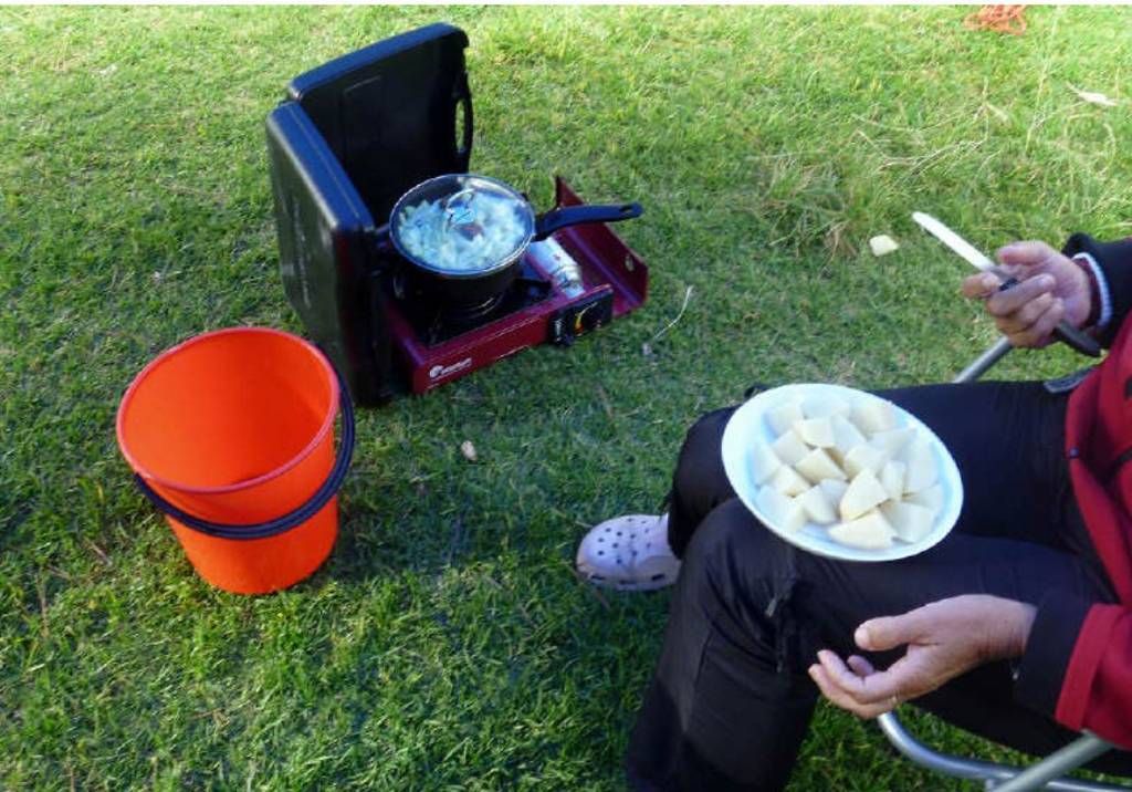 Abendessen auf unserem Gaskocher: gekochten Chabis, Salzkartoffeln, Rauchwurst.