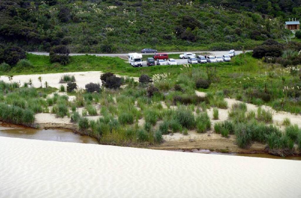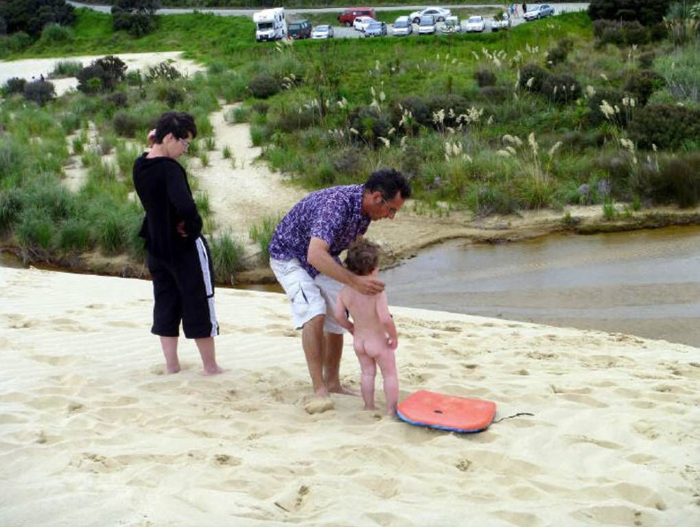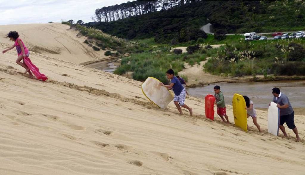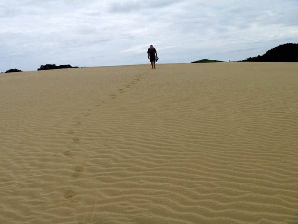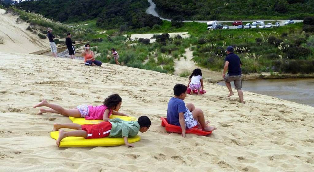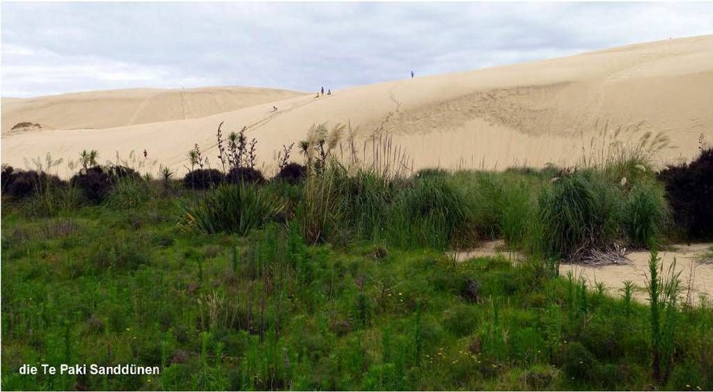 Wir fahren wieder südlich zurück, zu den riesigen Te Paki Sanddünen an der Tasmansee. Jung und alt amüsieren sich hier, mit kleinen Surfbrettern die gewaltigen Sanddünen hinunterzuschlitteln. Aber so richtig schnell laufen die Bretter nicht. Wir klettern schnaufend auf die Dünen hinauf und spazieren ein wenig herum. Danach, wieder unten, essen wir vor dem Auto unser Picknick und schauen dem lustigen Schlitteltreiben zu. Die Sanddünen sind einmalig schön. Sie erinnern uns sehr stark an die Wüste von Tunesien, nur ist der Sand hier weiss und nicht rötlich.
