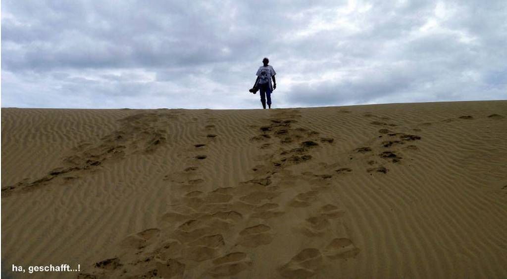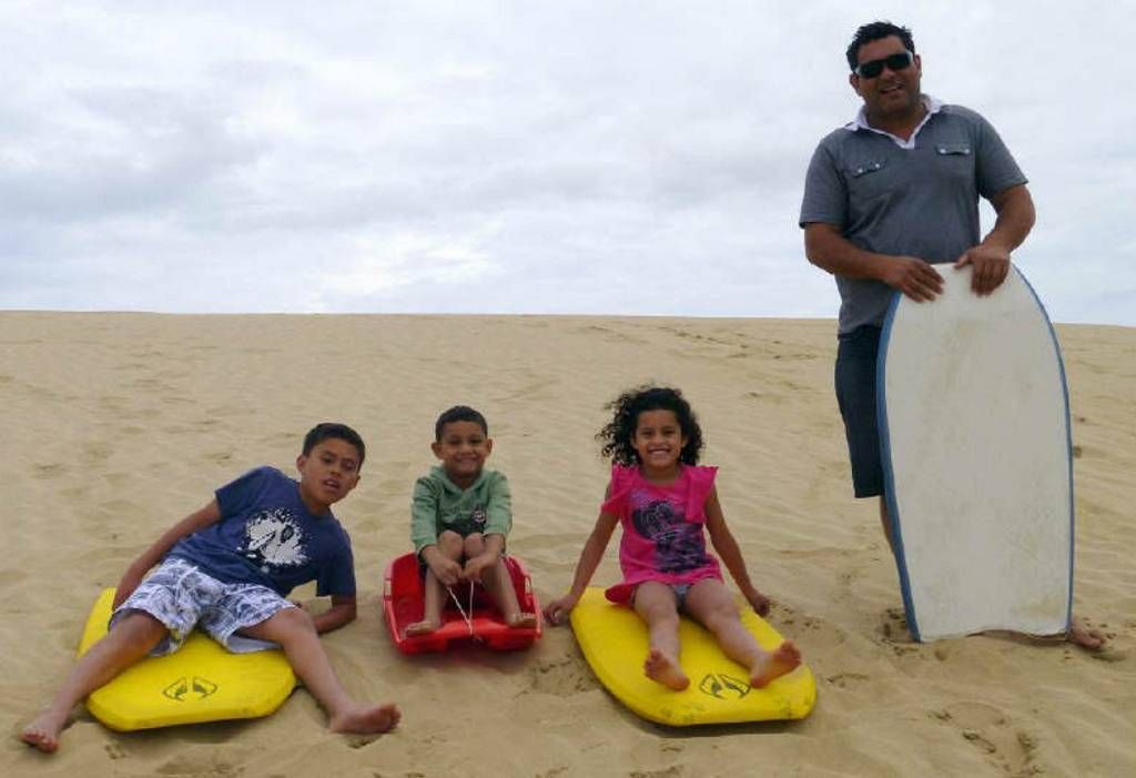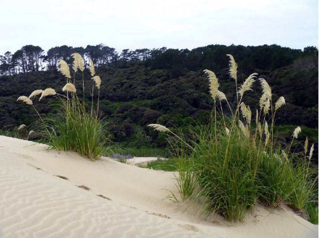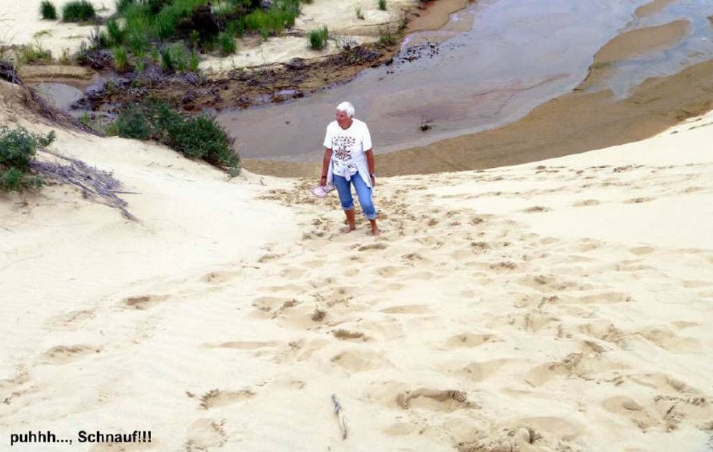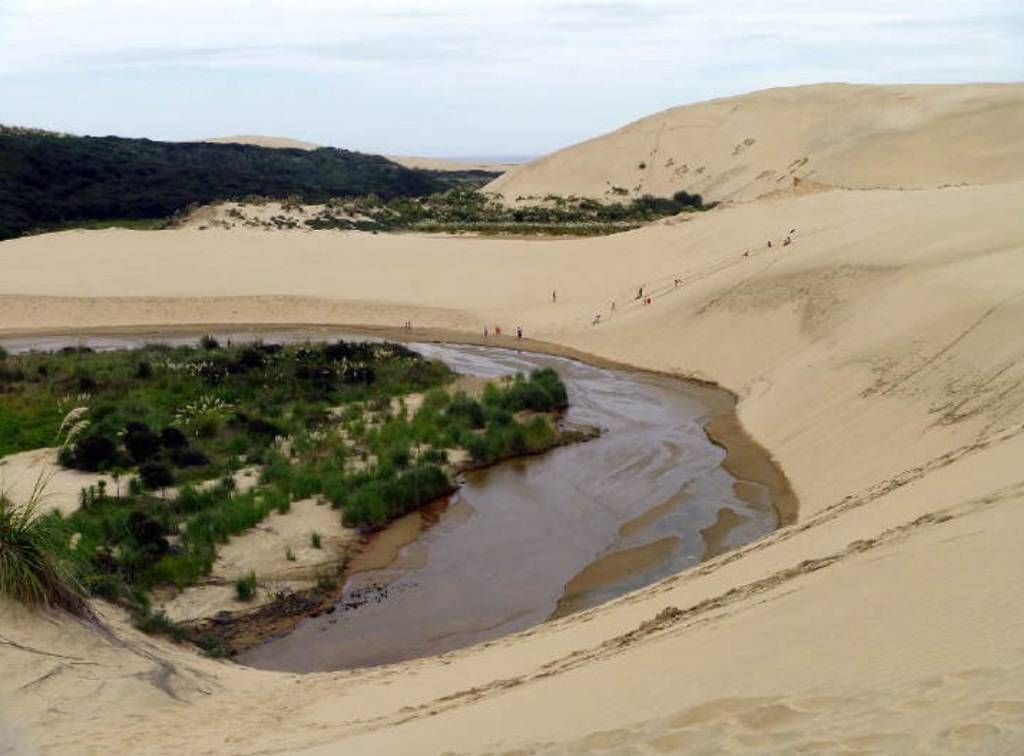 Wir fahren wieder südlich zurück, zu den riesigen Te Paki Sanddünen an der Tasmansee. Jung und alt amüsieren sich hier, mit kleinen Surfbrettern die gewaltigen Sanddünen hinunterzuschlitteln. Aber so richtig schnell laufen die Bretter nicht. Wir klettern schnaufend auf die Dünen hinauf und spazieren ein wenig herum. Danach, wieder unten, essen wir vor dem Auto unser Picknick und schauen dem lustigen Schlitteltreiben zu. Die Sanddünen sind einmalig schön. Sie erinnern uns sehr stark an die Wüste von Tunesien, nur ist der Sand hier weiss und nicht rötlich.