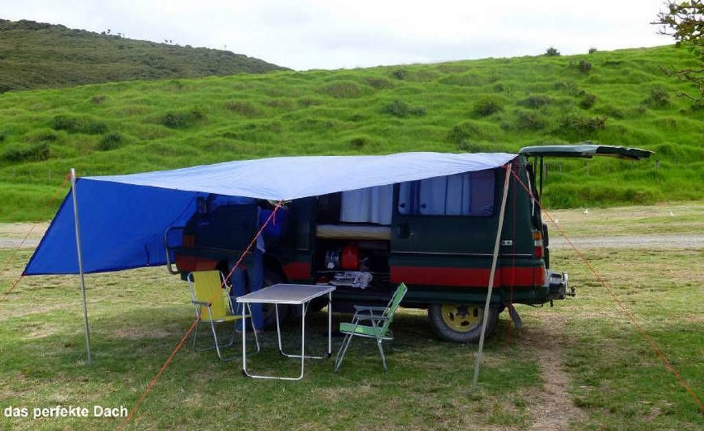 In Ahipara beziehen wir unser Nachtquartier auf dem von Maoris geführten Kawanga Camp. Das Aufspannen der blauen Blache geht heute schon fast professionell, auch ohne Werner's Auto.