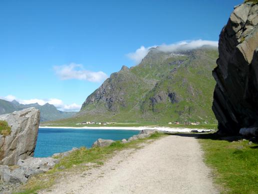 Es regnet und ist 12 Grad kalt. Nun fahren wir wieder nordwärts und je nördlicher wir kommen, desto besser wird das Wetter. Kein Regen mehr. Bei Flakstad wollen wir ein Kirchlein besichtigen. Der Eintritt kostet 4 € /Person und wir lehnen dankend ab. Wir fahren durch ein Dorf das Bø heisst. Später sind wir in Nusfjord. Die Lofoten scheinen ein sehr teures Pflaster zu sein. Um das Fischerdorf Nusfjord zu besuchen, muss man 7.50 € /Person Eintritt bezahlen. Mann, sind wir denn Millionäre? Wir lassen es sein, spazieren ein wenig in der Gegend herum und picknicken danach im Camper. Um 14h30 sind wir in Haukland. Unserem heutigen schönen Etappenziel, das Paul für uns ausgesucht hat. Dieser Platz liegt an einem schneeweissen, wunderschönen Sandstrand. Wir machen sofort eine 9 km lange Wanderung, rund um den Berg und zurück. Um 17h sind wir wieder beim BONSAICAMPER und gönnen uns ein Bier, das wir jetzt verdient haben. Das Wetter ist schön, auch wenn es immer wieder ein paar Wolken hat. Wir sind richtig glücklich, dass es nicht mehr so regnet und kalt ist wie gestern und heute morgen. Abendessen: Schweinsplätzli von „Paul‘s Grill Station“ mit Reis.