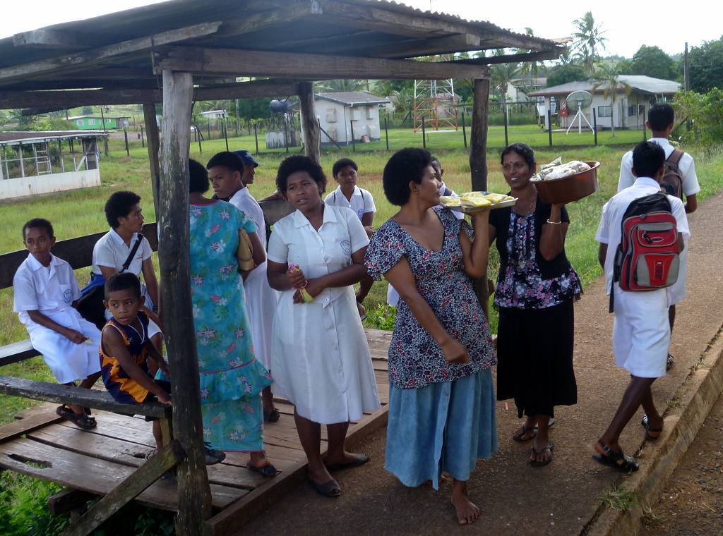 Unser erster Gang führt uns zu Vodafone. Oliver, Daniel und ich wollen ein FlashNet (Stick fürs Internet) kaufen, die sind ja in Savusavu total ausverkauft. Hier dauert das zwar ewig, aber es klappt immerhin einwandfrei. Jetzt geht es in ein Restaurant, wo wir alle zusammen ein gutes einheimisches Mittagessen verspeisen. Auch das dauert sehr lange bis es kommt, aber das macht nichts, es ist sehr gemütlich hier. Danach treffen wir uns alle wieder um 15h30 beim Busbahnhof. Kaum kommt der Bus, ist er schon fast wieder voll. Die 85 km lange Fahrt kostet 6.25 FJ$ (ca. 3.10 SFr.), komischerweise wollte der gleiche Fahrer heute morgen 8 FJ$ pro Person von uns haben. Der Bus ist ein Klapperkasten, der eigentlich ins Museum gehört. Paul meint, den würden sie nicht mal auf dem Schrottplatz nehmen...! Er, Paul, hat Horror, wenn er hört, wie der Fahrer die Gänge einmurkst und bei der kleinsten Steigung keucht der Bus mühsam dahin. Unterwegs muss der Fahrer noch Kühlwasser einfüllen, das er im Fluss holt. Wir kaufen unterdessen Bananen, etwa 8 Stück für 1 FJ$.
