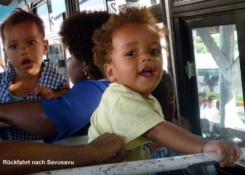 Bei der Rückfahrt sind wir total überfüllt. Und immer steigen noch mehr und noch mehr Leute ein, vor allem Schulkinder. Wir sitzen wie die Ölsardinen zusammen gedrängelt. Aber es ist interessant, die Leute zu beobachten. Ab ca.17h45 ist es dunkel und wir sehen gar nichts mehr. Später fängt es an zu regnen. Endlich haben wir es geschafft und kommen bei Regen beim Busplatz in Savusavu an.
