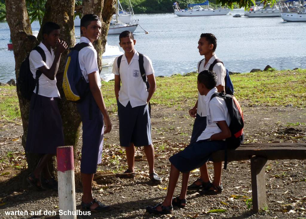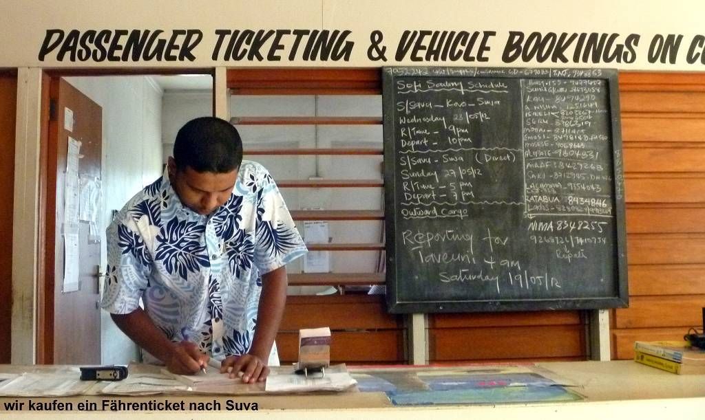 Wir haben schon wieder richtigen Stress! Um 7h rattert der Wecker und um 8h sind wir schon an Land und laufen ins Dorf (oder ist das eine Stadt? Paul sagt: ein Kaff oder ein Dörfli!) Savusavu. Wir gehen zu einem Büro, wo wir eine Schiffspassage mit der grossen Fähre nach Suva buchen. Wir müssen in Suva unser Visum für Indonesien beantragen. Wir laufen weit und Paul hat heute mehr Schmerzen in seinem Fuss: Wir waren gestern zu lange unterwegs.